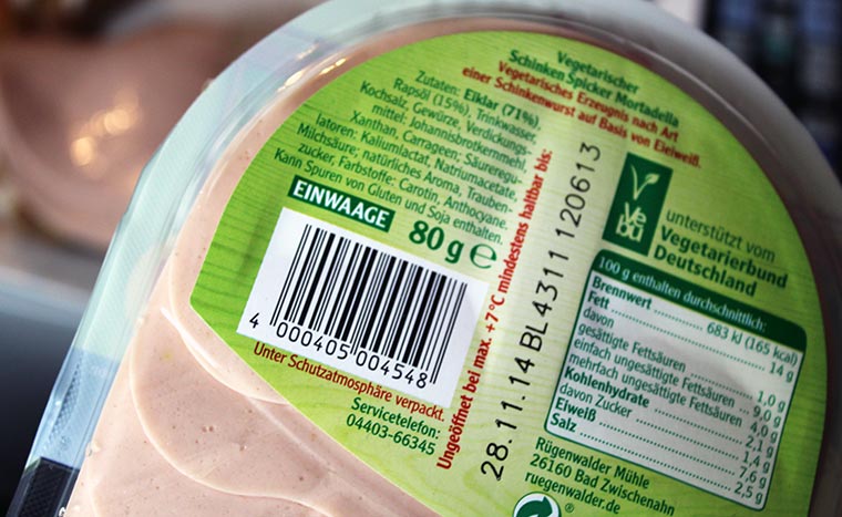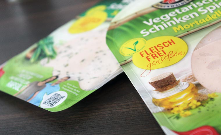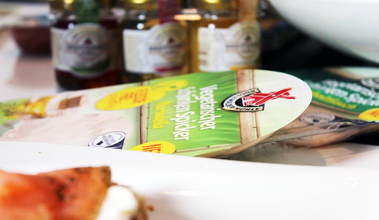 Zunächst die Rahmendaten: Neben der (auch bei den Fleischprodukten) präsenten Prüfung durch das SGS Institut Fresenius muss natürlich auch der vegetarische Standard gewährleistet sein. Gerade in einem bislang absoluten Fleischbetrieb wirkt das zunächst wie eine utopische Herausforderung. Aber während des kompletten Prozesses gibt es keinen direkten oder indirekten Kontakt mit Fleisch, da in einer gesonderten Abteilung an den Veggie-Erzeugnissen gearbeitet wird. Das zeigt sich letztlich in der Kennzeichnung mit dem europäischen V-Label der Kategorie „vegetarisch“ und der Unterstützung durch den Vegetarierbund Deutschland. Vegetarischer Standard: Check.