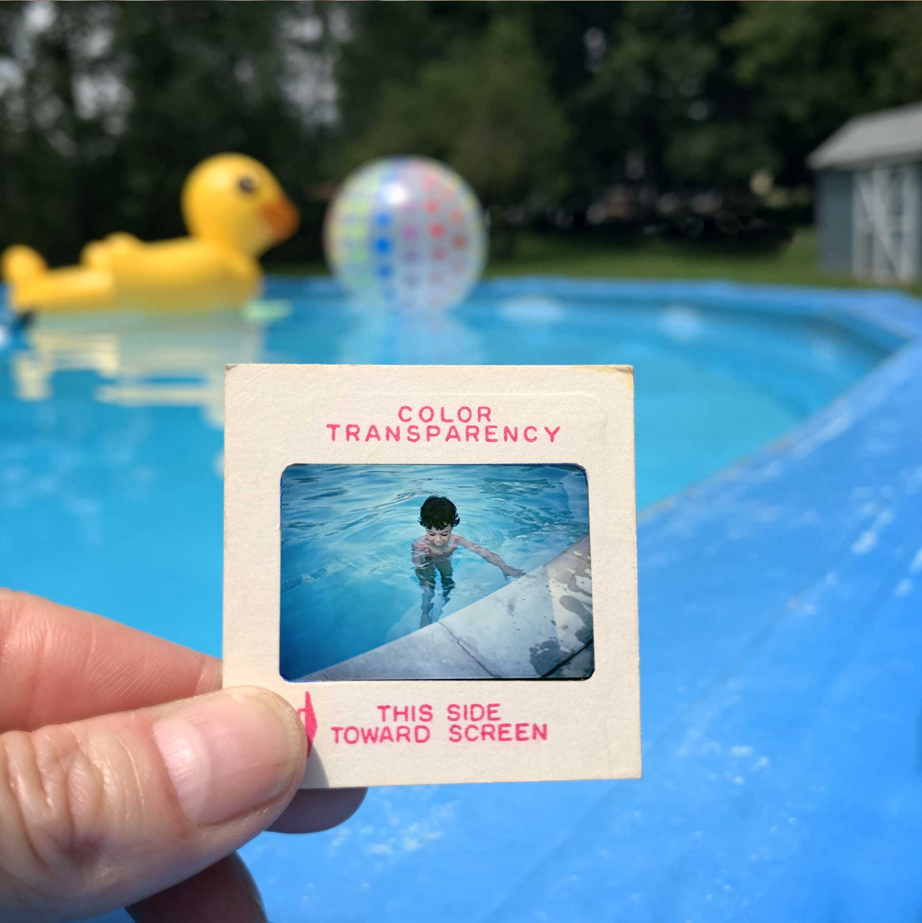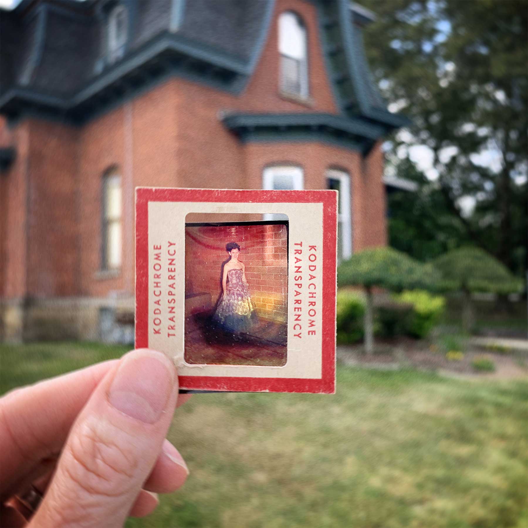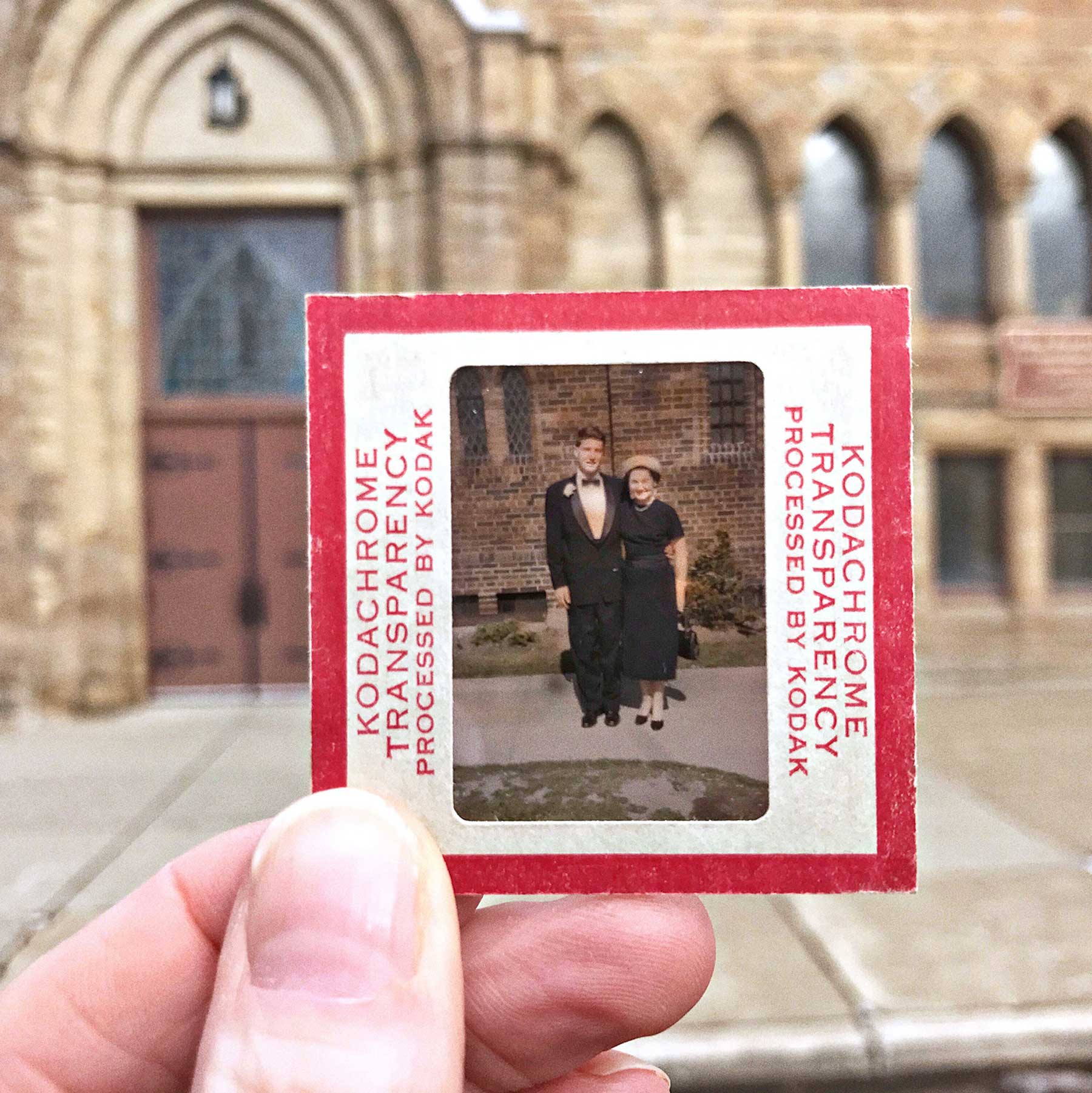 „I realized that by placing the slides in my current landscape, I created not only a connection between his life and mine, but a trail of memories, each that had its own association for both of us. A lot of these slides are of my mom, they were together almost 60 years. She passed away recently and I feel like her spirit, and all the spirits of the past, are around us. These little vignettes of family life in my current ’space‘ comforts me that she and others are still near, watching over me. They create a ‚home‘ for me wherever I go. I did not want to Photoshop that connection. Part of the process that was necessary for me was to find the right location and feel my dad’s slides united with how I live today – a place within a place, a memory within a memory.“ (Artist Statement)