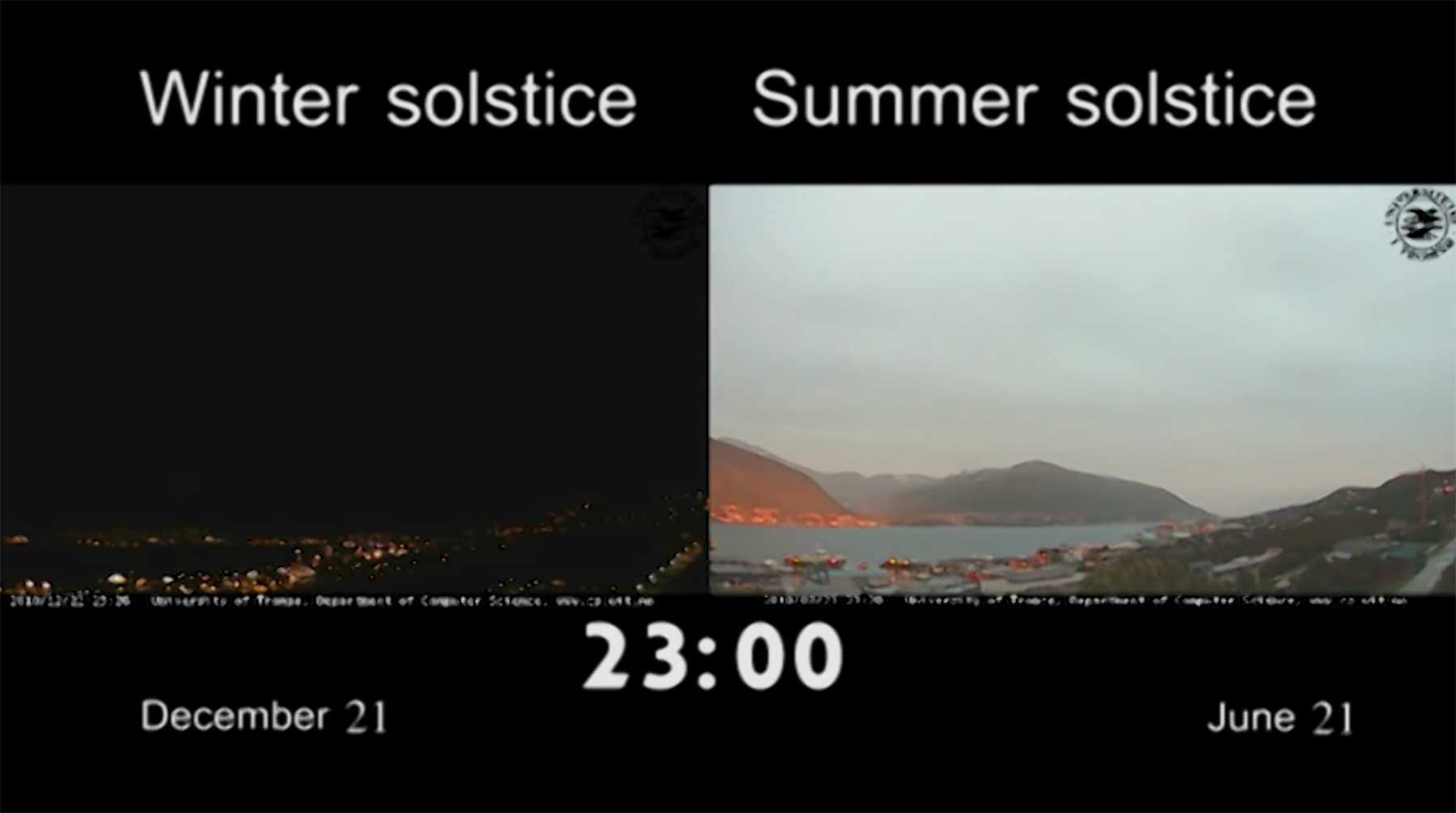 Um 14 Uhr bereits dunkel und Sonnenlicht um 3 Uhr nachts. Solch für uns skurrile Tageslicht-Extreme sind in nordischen Gefilden ganz normal. Stig-Lennart Sørensen zeigt uns mit einer recht simplen Zeitraffer-Gegenüberstellung, wie unterschiedlich so ein Tag im norwegischen Tromsø zu den jeweiligen Sonnenwenden in Sommer bzw. Winter ablaufen. Wenn der nächste Winter hier kommt, dürft ihr nicht meckern, dass bereits ab 17 Uhr dunkel ist…