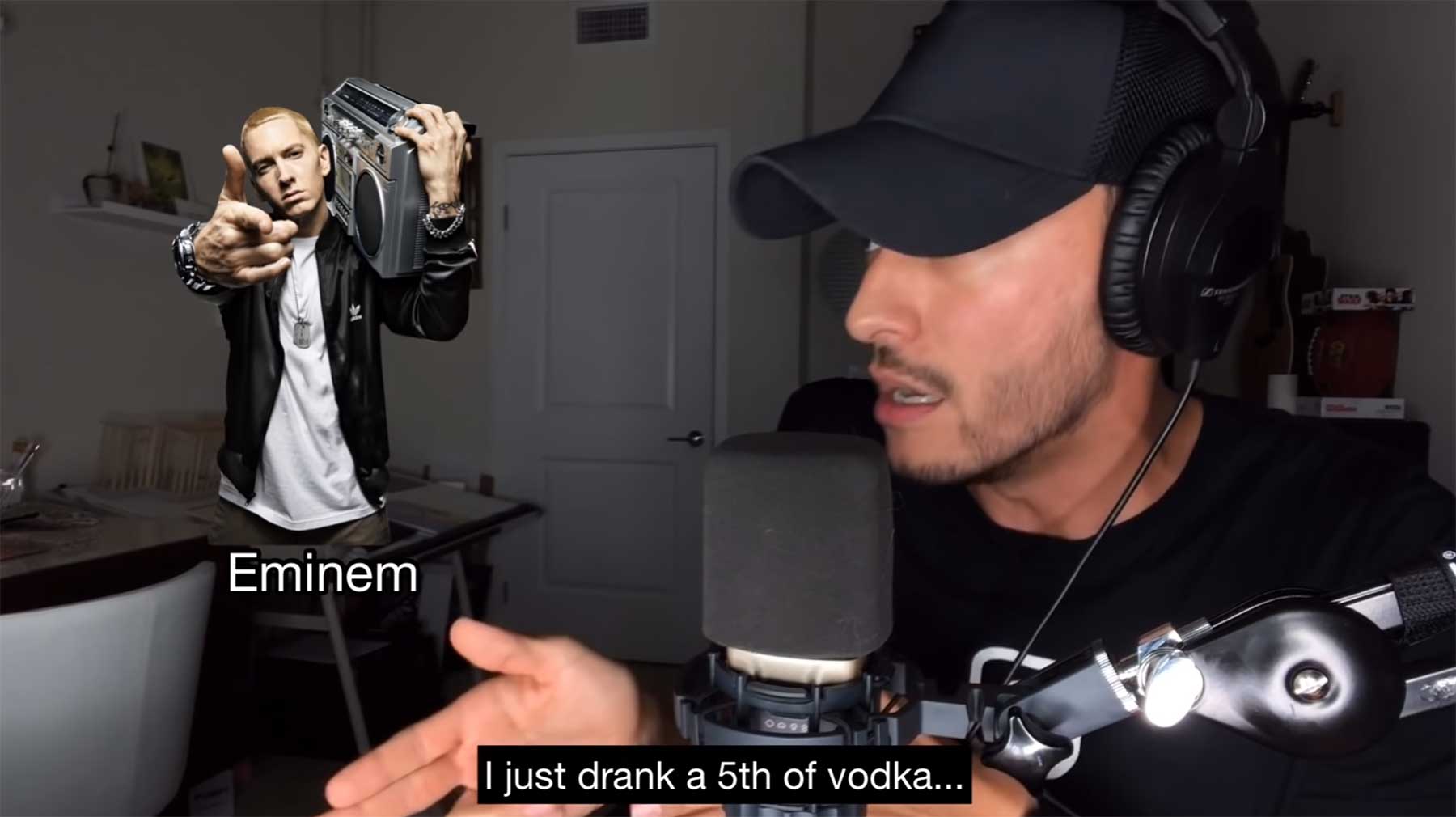 Das ist schon ziemlich beeindruckend, was Stimmen-Imitator Vincent Marcus da hinlegt. Spielerisch wechselt er intuitiv und ohne Videoschnitt zwischen den Stimmfarben und vor allem Flows weltbekannter Rapper. Klar, die sind jeweils für sich so bekannt und in ihren Arten charakterlich ausgeprägt, dass einzelne Aspekte ausreichen, um einen Wiedererkennungswert hinzubekommen, aber auch im Detail weiß er ganz gut an die Originale heranzureichen. Einfach mal die Augen schließen und schätzen, wen er denn da jeweils intoniert…