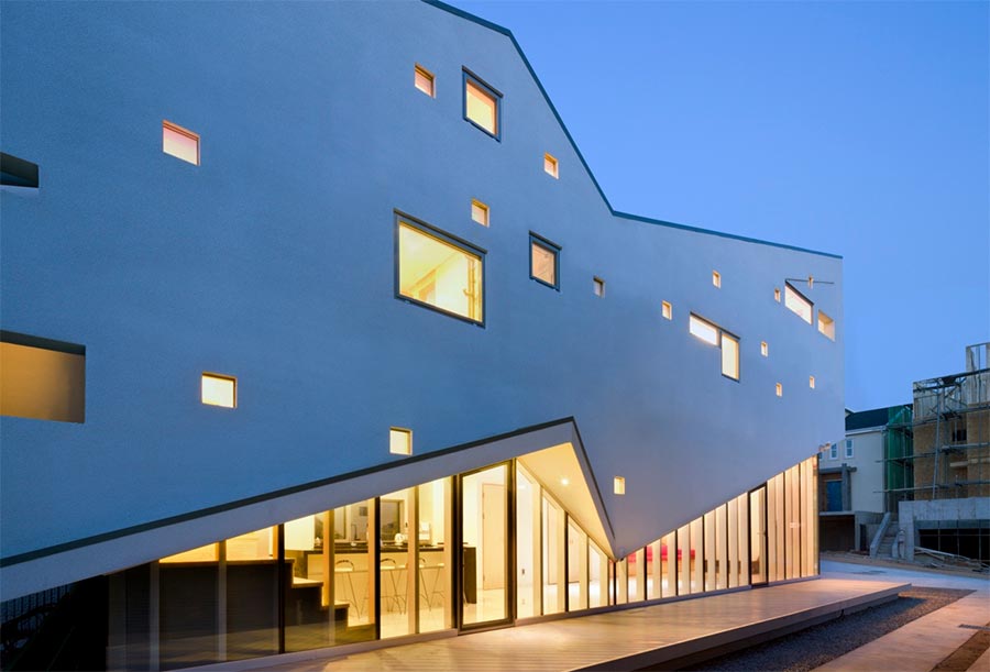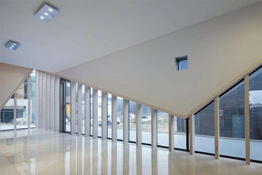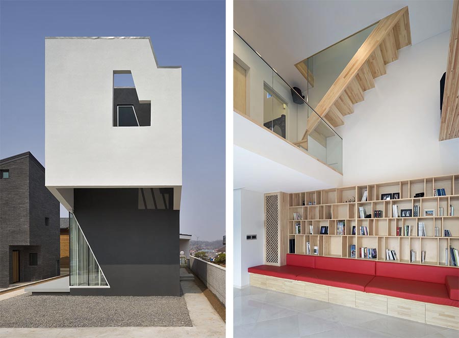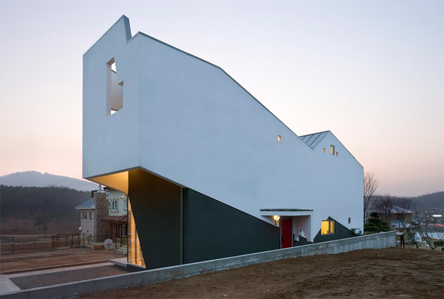 Ein tolles Privathaus-Design des aus Seoul stammenden Architekten Moon Hoon. Das Visang House ist mehr oder weniger ein langgezogener Container, der aufsteigend und dynamisch brechend inszeniert wird – ein wenig wie ein aufstrebender Tendenz-Graph von gut laufenden Aktien. Kohle scheint beim auftraggebenden Paar jedenfalls vorhanden gewesen zu sein.