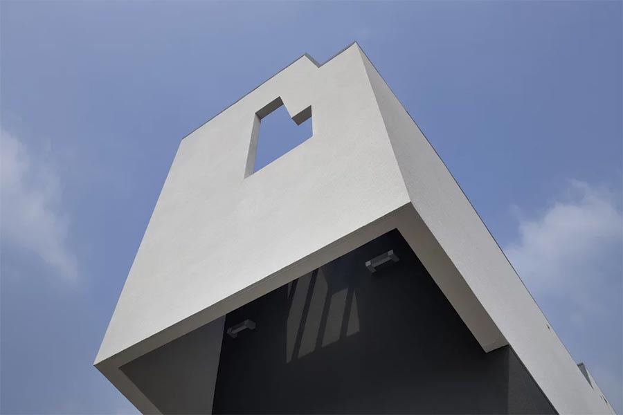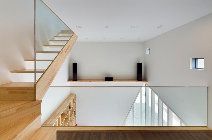 „On day, a young and energetic couple paid visit to my office. A rush to the site against the heafy rainstorm almost droned me. The site was long and thin having a mountain view. I designed a house with the client’s vibrant energy, resulting in a rising form. The interior holds a place like an opera balcony, where they can enjoy movies.“