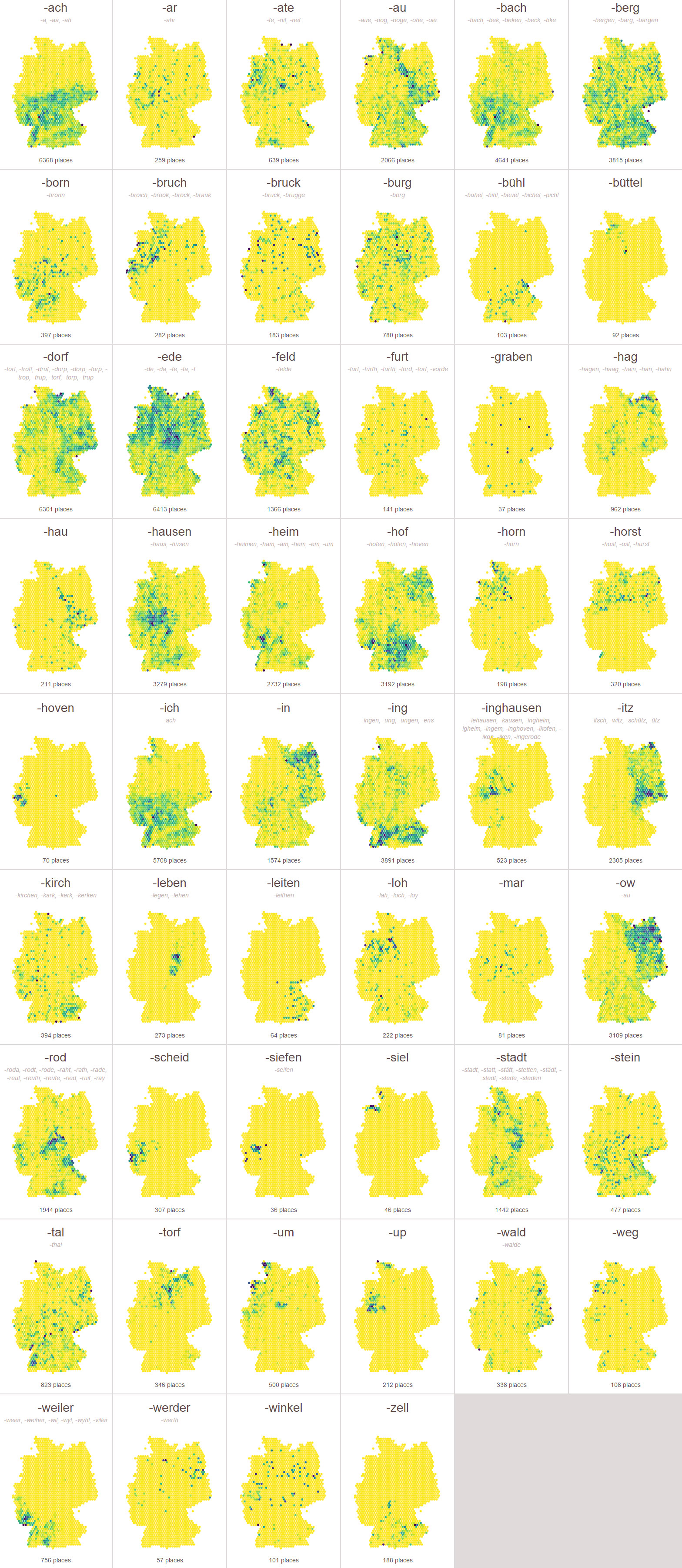 Interessante Daten-Visualisierung von Moritz Stefaner aus Lilienthal. „T(h)al“ kommt als Suffix deutscher Orts- und Städtenamen seiner Erhebung nach 823 Mal in Deutschland vor und ist einigermaßen verbreitet (bis auf den Nordwesten). Genau solche Darstellungen hat Stefaner für die 52 am meisten vorkommenden Ortsnamen-Enden erstellt.