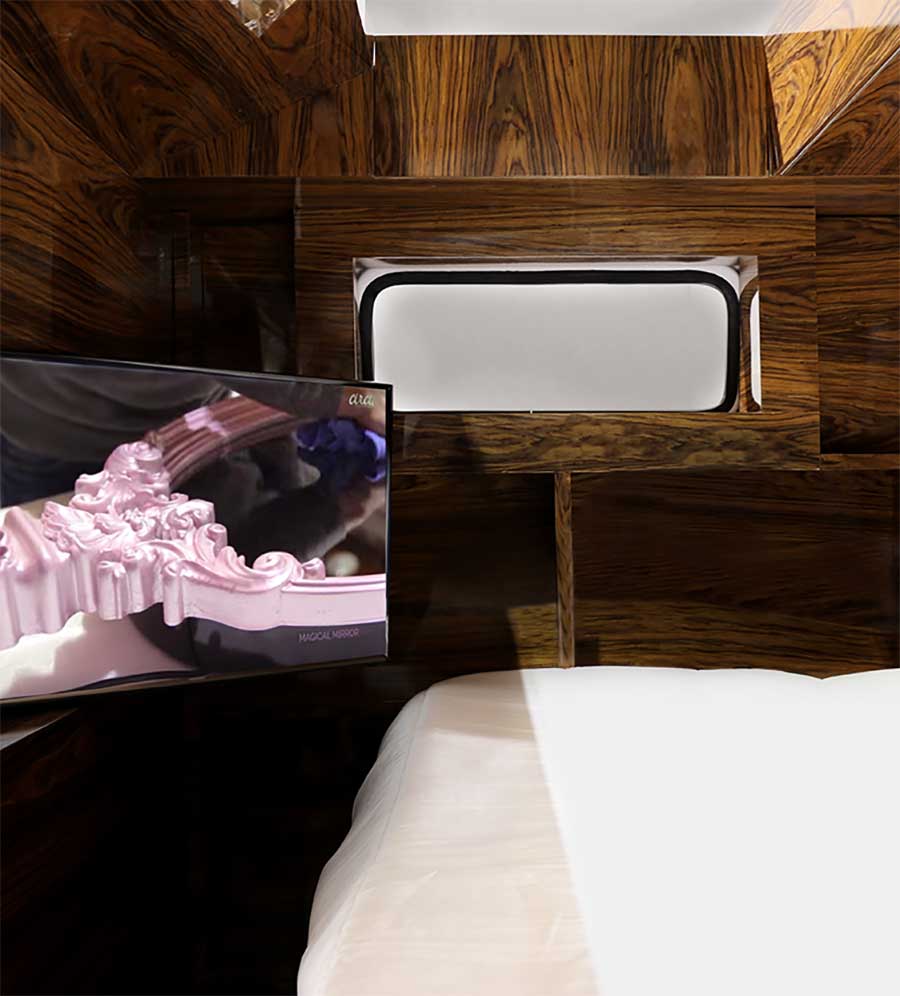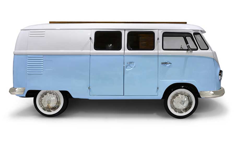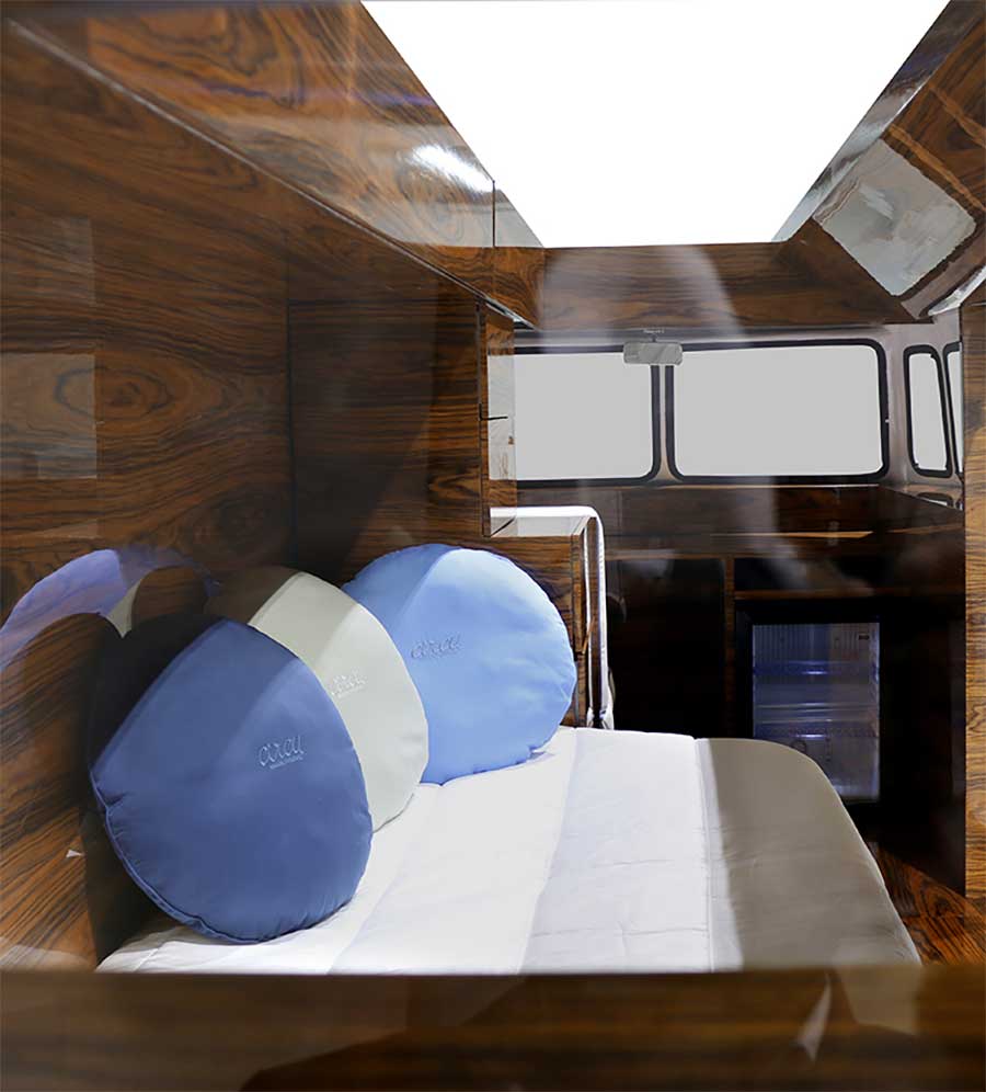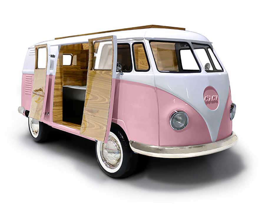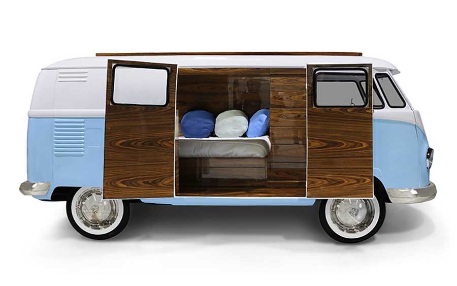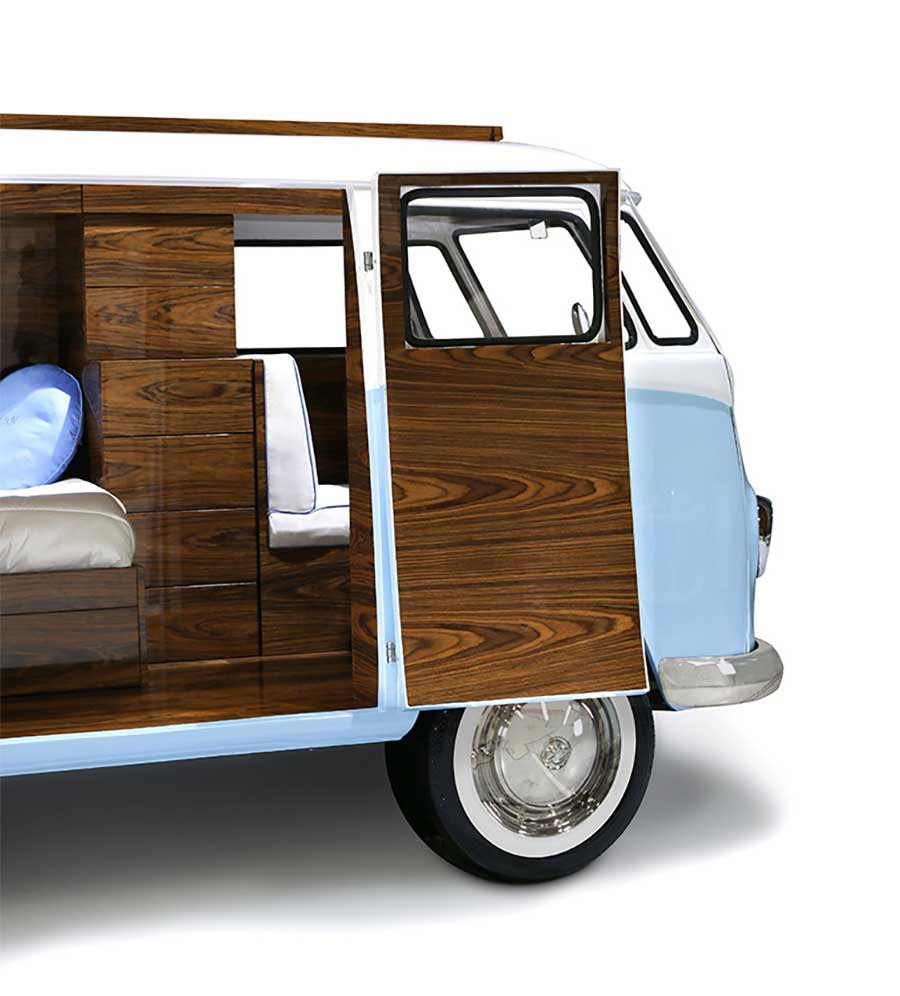 „Bun Van is a unique kids bed inspired by the iconic 60’s camper van Fillmore from the Disney movie “Cars”. It is perfect to bring a total experience of fun and play to the children’s rooms. With the Bun Van, bedtime will be like an adventurous road trip. The exterior is produced in fiberglass with chrome-plated finishes and the inside is made of palisander wood veneer, containing several storage compartments, a bed, a TV, desk, mini bar and a sofa. It is a complete bedroom set for a children’s space.“