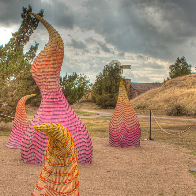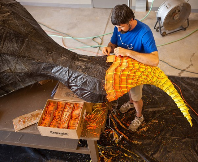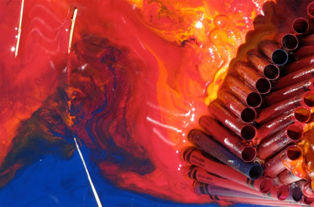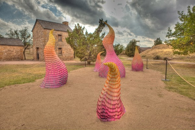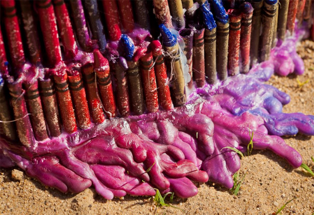 Im National Ranching Heritage Center der Texas Tech University in Lubbock hat der amerikanische Künstler Herb Williams seine Crayola-Projekt Unwanted Visitor: Portrait of Wildfire aufgestellt. Fünf aus Wachsmalstiften bestehenden Flammen-Skulpturen, die kürzlich geschehene Flächenbrände symbolisieren sollen. Seit 7 Oktober stehen die Dinger da und zerfließen nach und nach in der texanischen Mittagssonne.