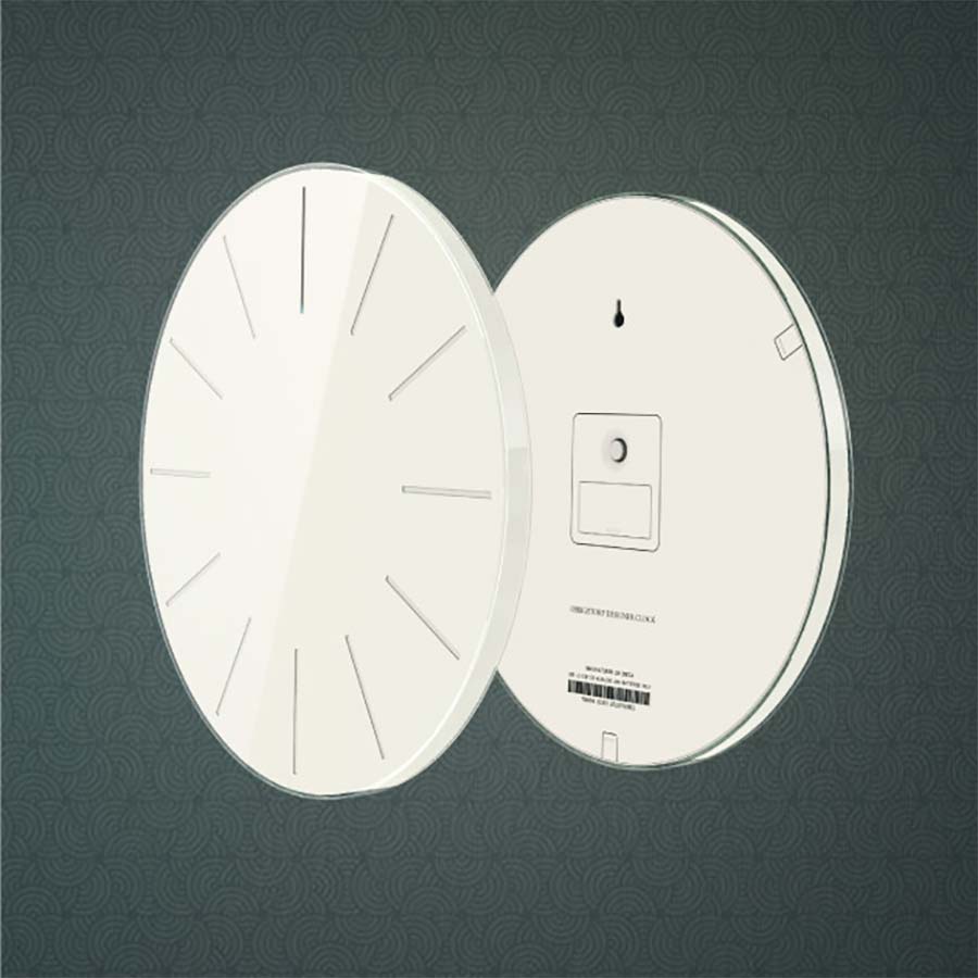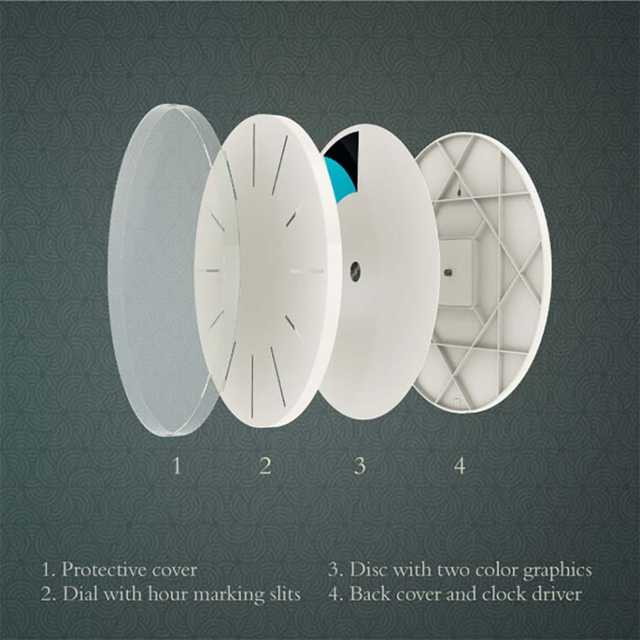 „It’s a clock that does not have any hour or minute hands. Instead the hour markings dynamically change to show the time. Even though it looks very different from any common clock, it uses exactly same mechanism as a normal clock.“