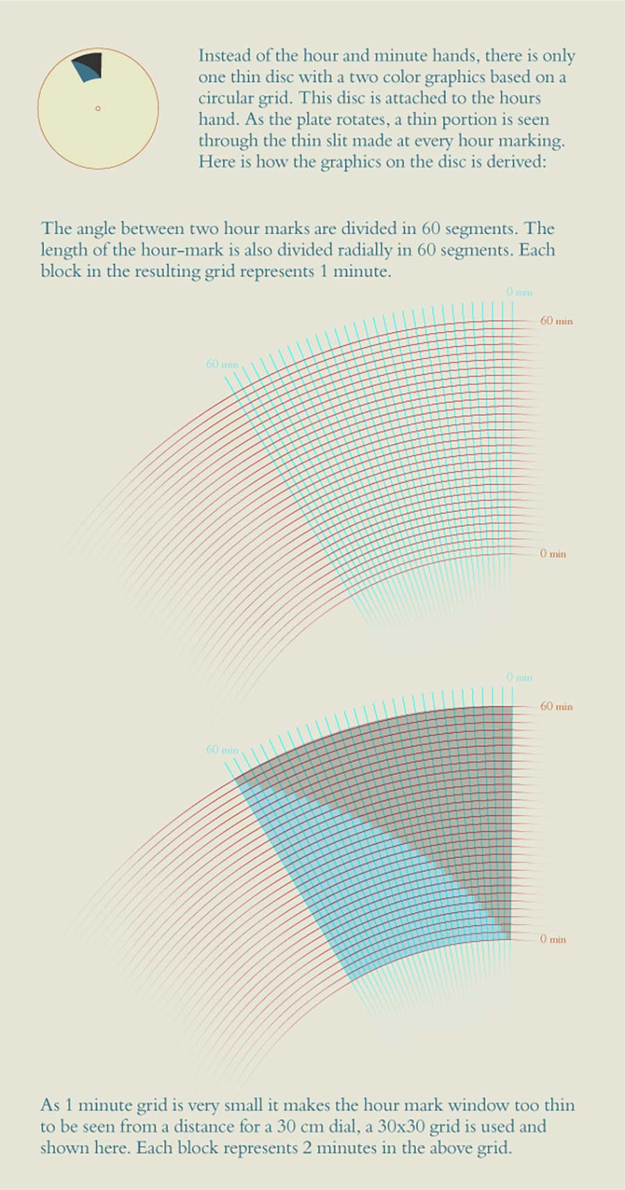 „For example at 3 o’clock the 3rd hour marking becomes dark and then a colored bar (here blue) starts growing within the 3rd marking at every minute until the 59th minute. Then the 4 o’clock marking become fully dark and the same process continues.“
