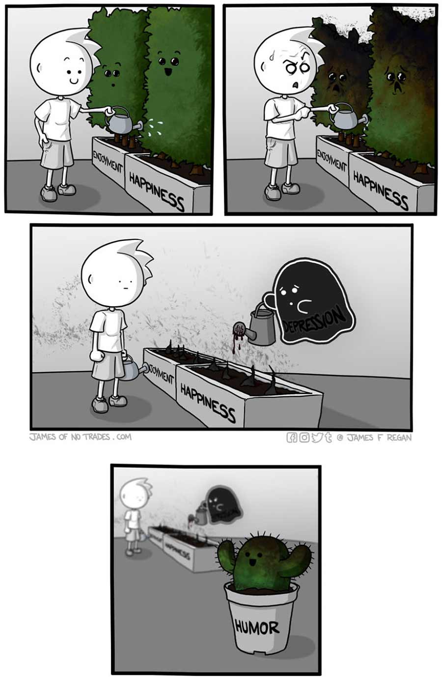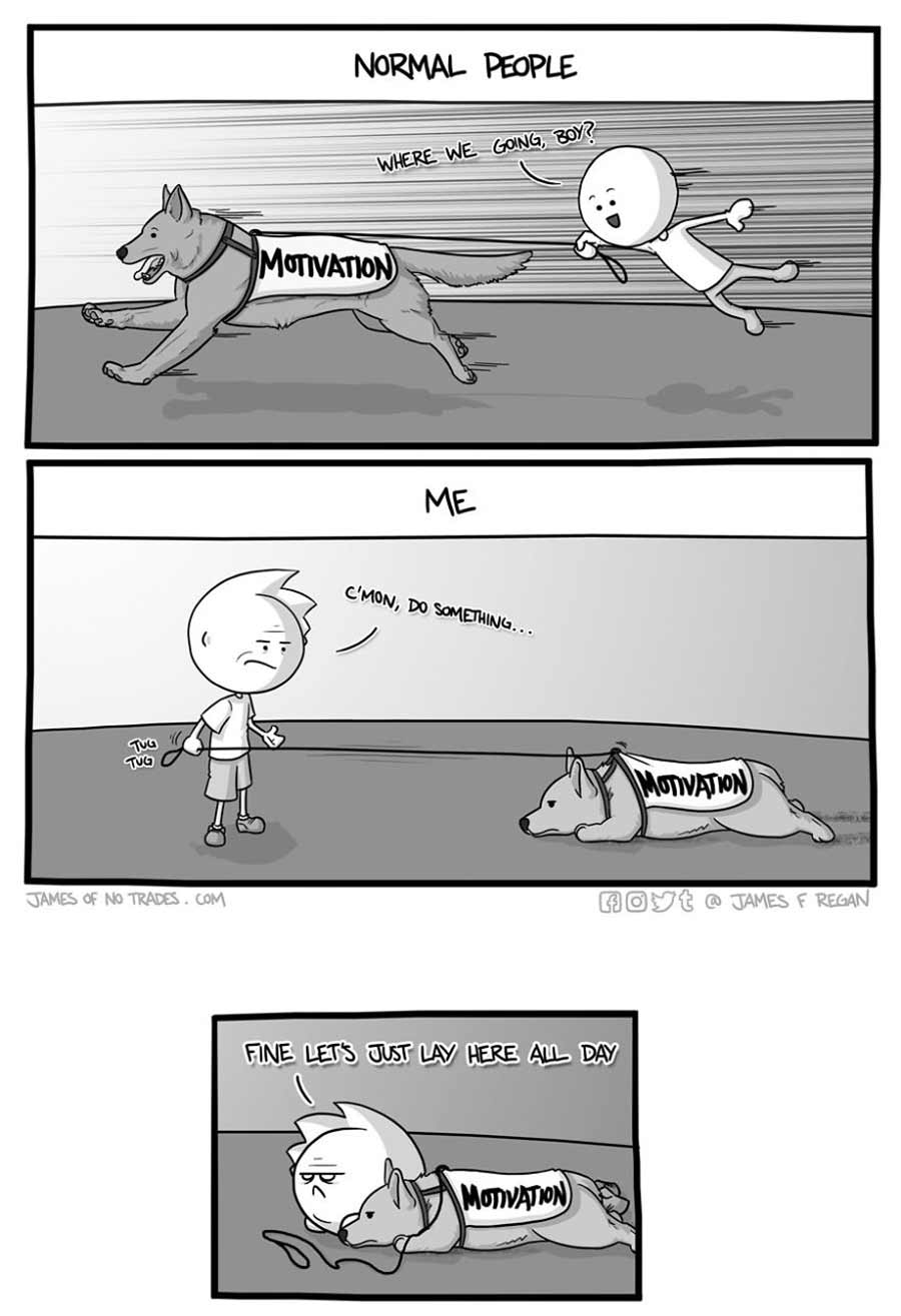Vermutlich habt ihr bereits mindestens eines der tollen Mini-Webcomics von James Regan gesehen. Unter dem Namen „James of no Trades“ veröffentlicht der Kreative aus Los Angeles wöchentlich einen Strip, der von all den Dingen im Leben handelt, die viele von uns auch kennen. Prokrastination, fehlende Motivation – oder gar Depression. Dabei verbindet Regan gekonnt alles mit einem tiefschwarzen Humor, egal, ob es lockerleichte Alltags- oder tiefsitzende Psychologie-Themen sind. Hier eine kleines Auswahl.