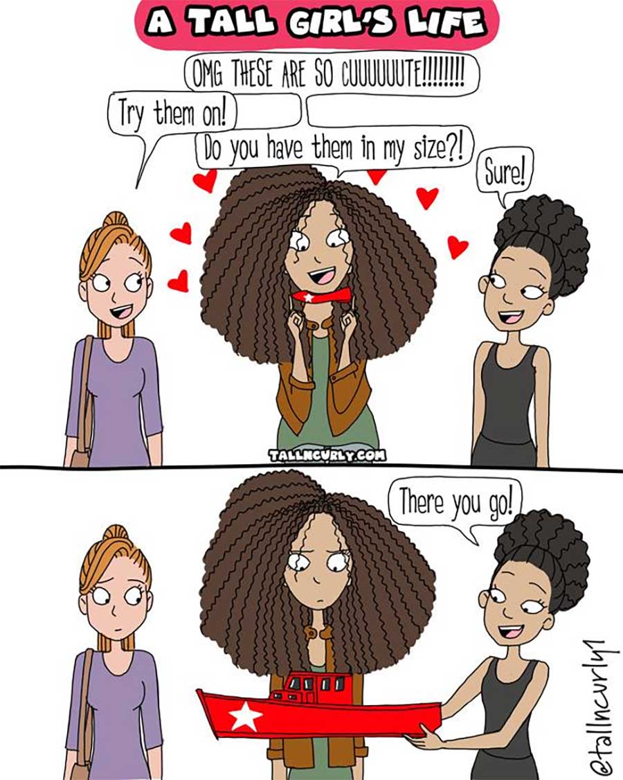 Mein Lieblingsmädchen ist großgewachsen und daher kenne ich (und kennt vor allem sie) all die Seltsamkeiten, die damit einhergehen, sei es rein physisch oder gesellschaftlich. Die ständige Frage nach dem „Wie groß bist du?!“ oder Probleme beim Einkauf von Schuhen, etc. Deshalb wird ihr vieles aus den Webcomics von „Tall N Curly“ bekannt vor kommen. Und doch gibt es Neues für sie, denn der „Curly“-Part, also die Inhalte rund um die prachtvolle Lockenfrisur, ist ihr als Glatthaarige nicht so geläufig.