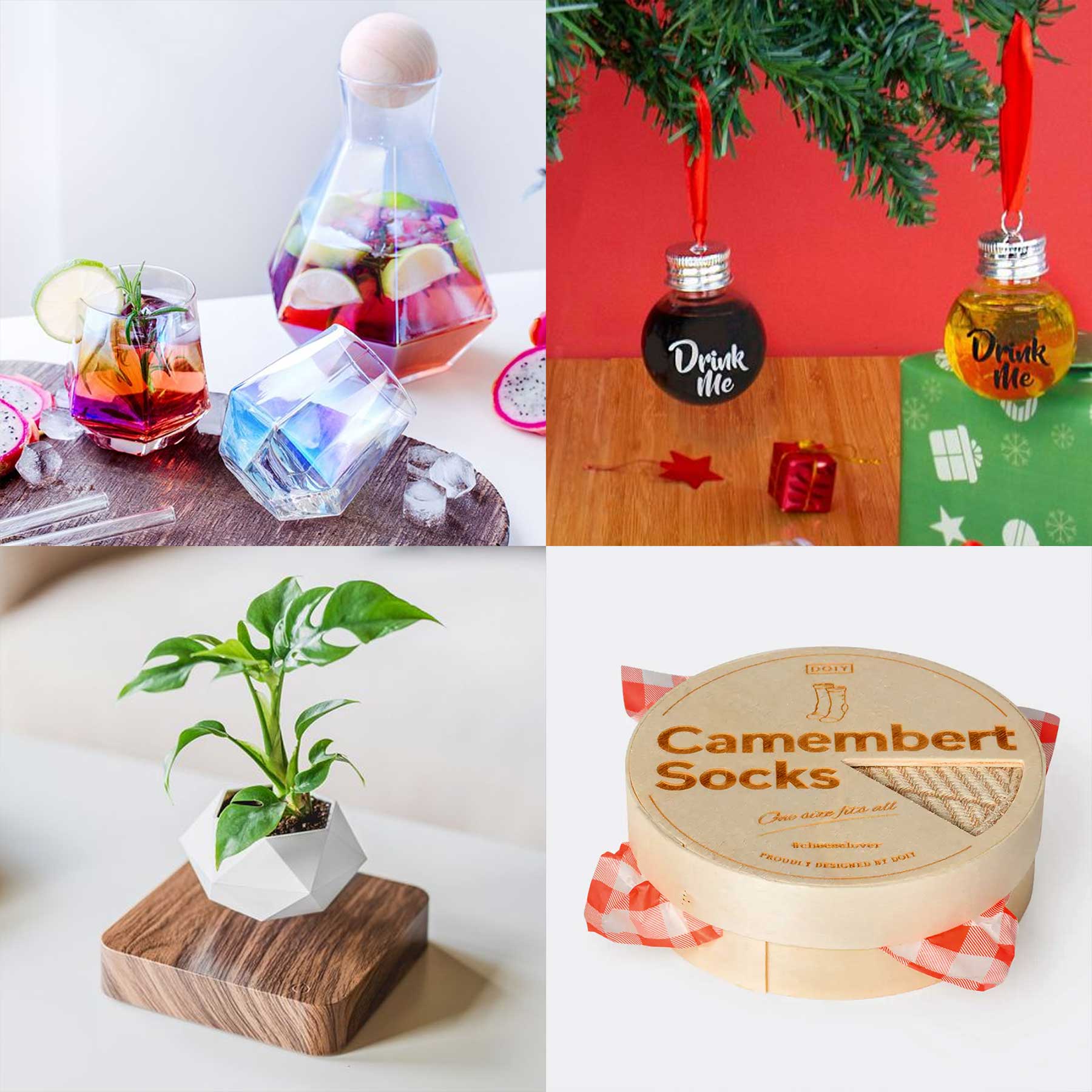 Für Foodies gibt es Likör-Weihnachtsbaum-Kugeln oder ein verkehrt herum aufgestelltes Weinglas. Richtige Käsefüße gibt es mit den Käse-Socken, die selbst eher allgemeingültig designt sind, aber mit sehr schicken Verpackungen daher kommen.