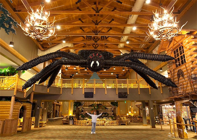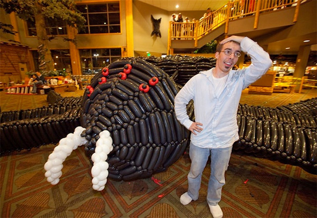 Adam Lee hat es mit seiner Riesenspinne in das Guiness Buch geschafft. Die Kategorie Largest Balloon Sculpture hat er inne, mit knapp 3.000 eingesetzten Ballons, resultierend in 14 Metern Breite und 7 Metern Länge. Und das eigenlich Sensationelle: Die Skulptur besteht ausschließlich aus Luftballons! Kein Kleber, keine stabilisierenden Gerippe. Und er hat alles selbst gemacht. Langeweile deluxe? Jedenfalls nennt sich Lee selbst Balloon Genius. Und ich kann nichtmal ein kleines Hündchen Luftballonen…