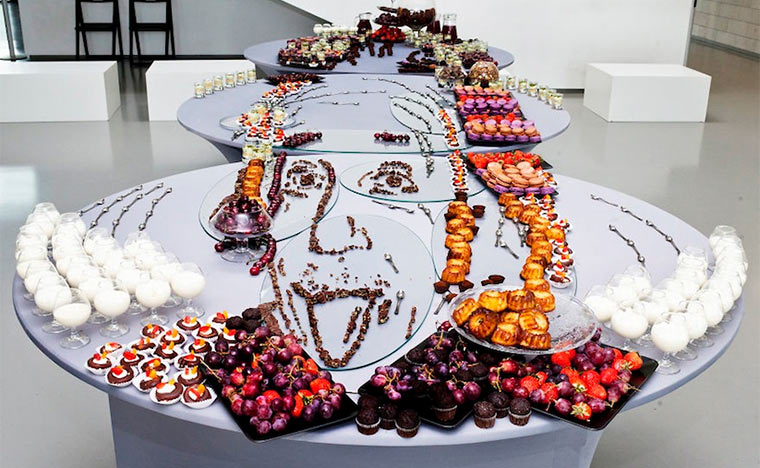„Sometimes when Emilija Vinzanovaite and I get tired of art installations, we make this: tasty and giant food arts, which should be eaten! The first one is a four meters long perspective (you can see this only from one angle) artwork with Einstein’s face. We worked for five hours to make it happen. It was made from different deserts like canelles, chocolate, muffins, strawberries, grapes, macaroons… It was really hard not to eat everything while working.“