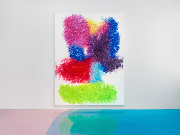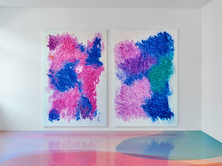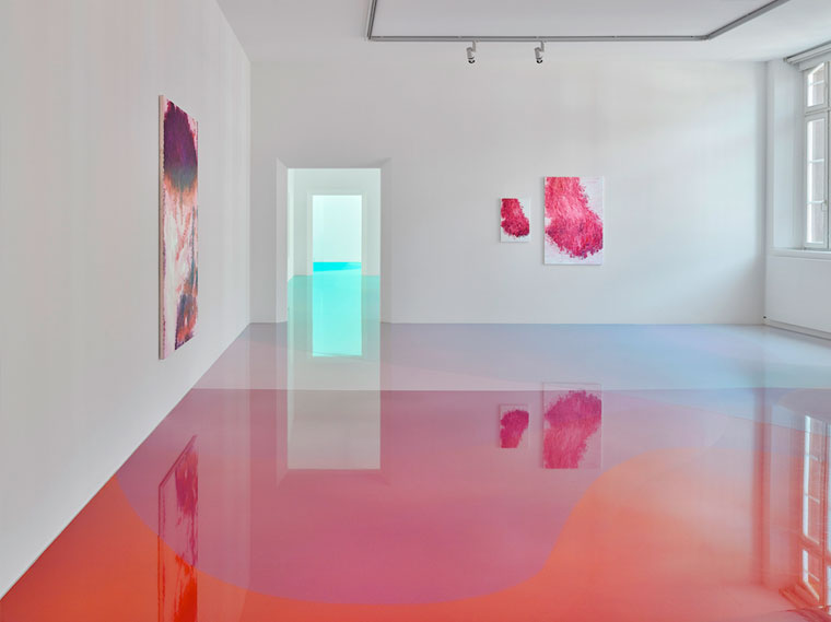 „The fact that visitors actually walk on it necessarily means that the surface will get scratched, destroyed. It develops a kind of patina as a result. Trainers leave scuff marks, high heels leave scratches. All of which are all interesting relicts…. I think that these traces correspond to the brush strokes of the oil paintings.“