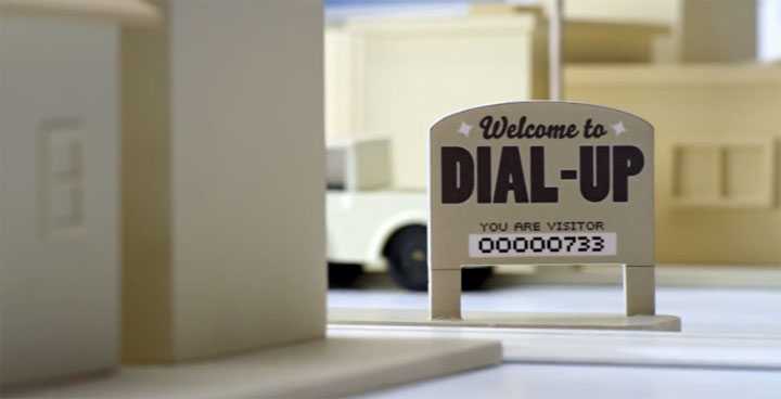 „In this video, we see the evolution of the Internet represented in three different stages. It started with Dial-Up, grew with Broadband — and with Google Fiber, the possibilities are endless.“