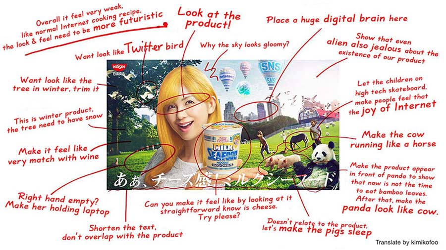 Lange Rede, kurzer Sinn: Für die japanische Marke „Nissin Cup Noodles“ sollte ein Werbemotiv geschaffen werden, das einige Anmerkungen erhielt. Die Zuständigen haben sich den Spaß erlaubt, einfach mal ALLES entsprechend umzusetzen und das Resultat online zu stellen. Ob das nun alles wirklich so lief oder zumindest mal überdreht dargestellt wird, sei dahingestellt – Aufmerksamkeit dürften sie mit der Aktion allemal generiert haben.