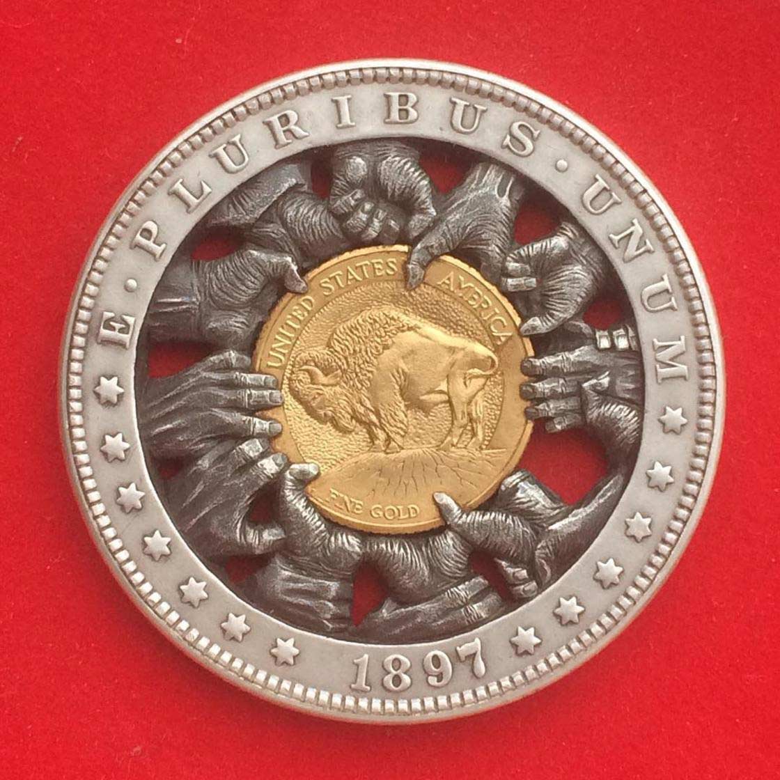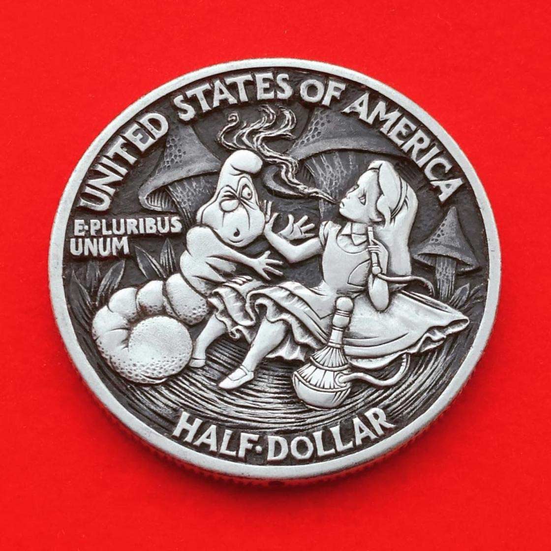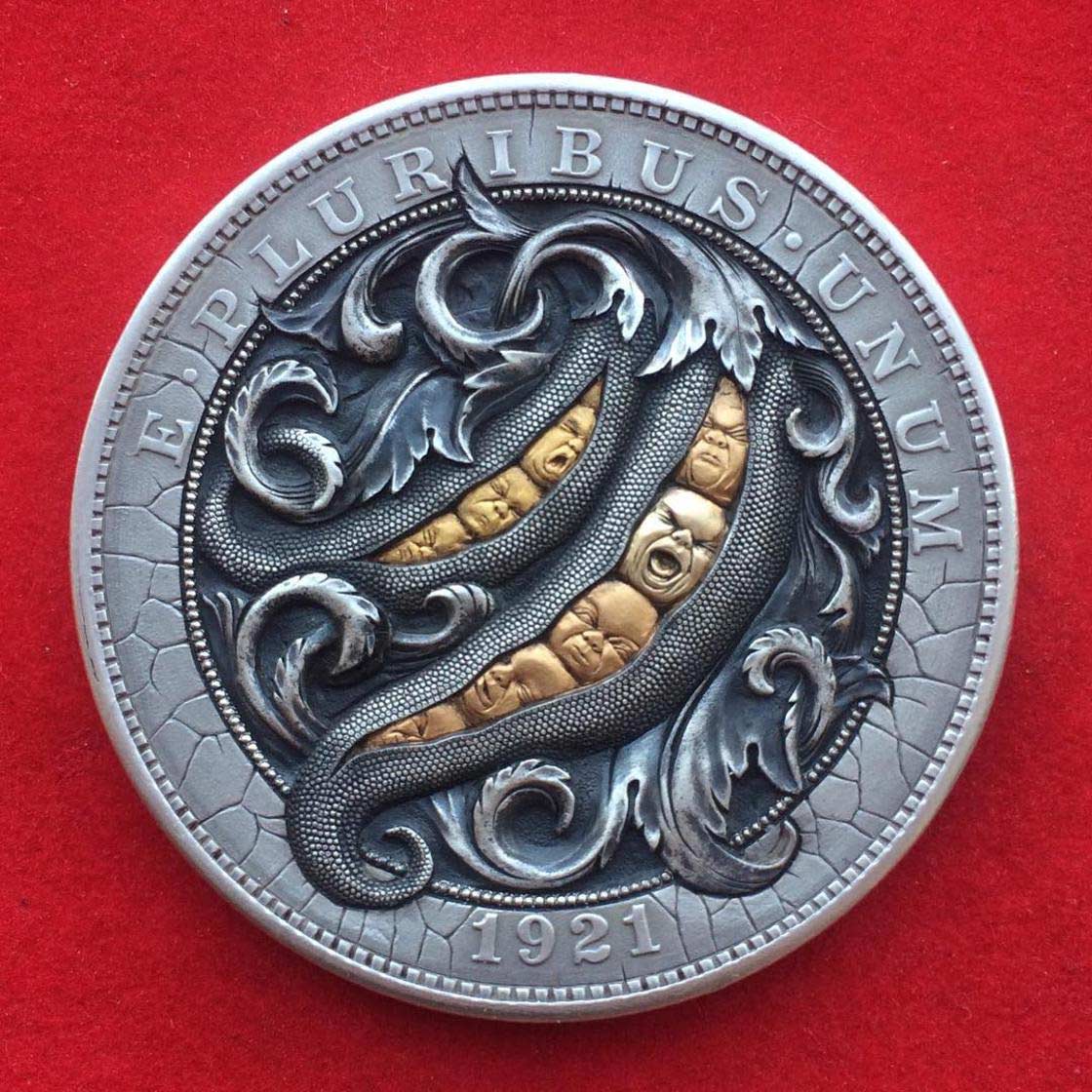 Wird aus einer Münze mittels Schleifen und Gravierung ein Kunstwerk, spricht man von einem „Hobo Nickel“ – egal, ob es nun ein Nickel ist, oder nicht. Ein Großmeister dieser Miniatur-Skulpturen ist Roman Booteen. Der russische Künstler verpasst den Geldstücken einen popkulturellen Anstrich und lässt uns wünschen, die Eurorückseiten hätten C. Montgomery Burns oder Spongebob auf ihnen. Wieso eigentlich nicht…?! Besonders gefällt mir, wenn er die unterschiedlichen Metallarten und -Schichten ausnutzt, um farbige Kontraste hervorzubringen. Stark!