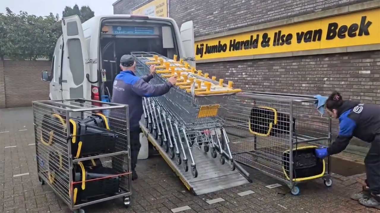 Wer hätte gedacht, dass es eine Art Waschanlage für Einkaufswagen gibt? Und dass diese noch dazu selbst in einem Wagen (bzw. Van) integriert ist? Das ist also quasi ein Wagenwaschanlagewagen! Da werfen nicht nur Scrabble-Freund:innen ihre Hände in die Luft. Hier bekommen so ein Teil beim Einsatz vor dem Supermarkt Jumbo Panningen zu sehen: