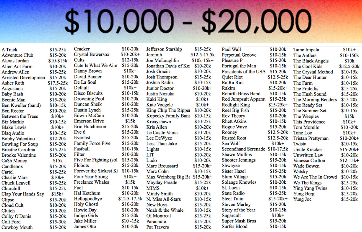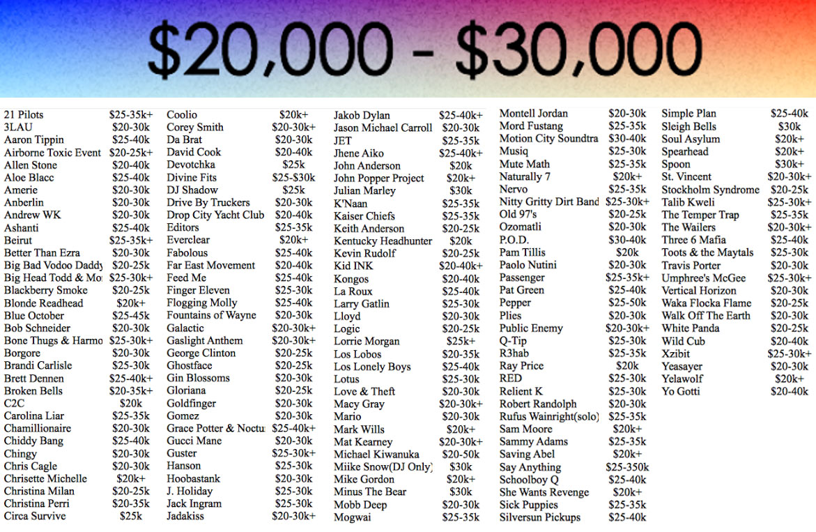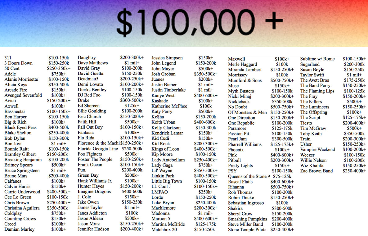 Klar, Metallica, Madonna und die anderen Headliner da draußen, die so ein Festival so richtig ins Rollen und auch andere Nachzüglerbands auf den Plan ziehen. „Ach, der Justin ist da? Okay, dann kommen wir auch, cooler Typ! Also Timberlake…“. Nein, die Booker müssen so richtig in die Tasche greifen. Zumindest, wenn man den Angaben der Booking Agency Degy Entertainment Glauben schenken möchte. Die haben eine Liste veröffentlicht, in der etliche Acts und ihre (groben!) Buchungskosten drin stehen. Gerade wir Online-Werbefutzies wissen natürlich, dass hier und da Netto nochmal was deutlich anderes machbar sein sollte, aber zwischen 1 Mio.+ Dollar für Justin Bieber und lächerlichen 7 bis 10 Tausend(!) Dollar für We Ar Scientists liegt schon ein kleiner Unterschied.