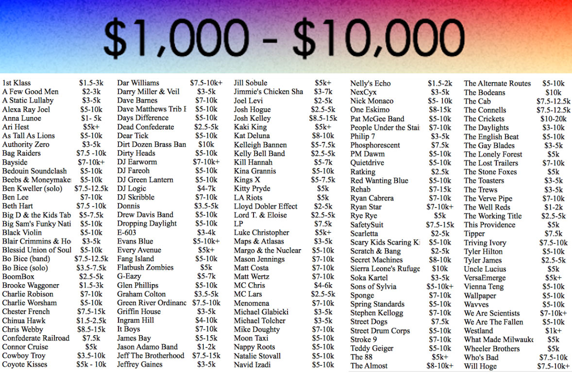 Mit Klick auf die Bilder könnt ihr sie übrigens größer ziehen. Da sind schon einige Kuriositäten bei, oder? 3 Doors Down z.B. noch so teuer? Imagine Dragons? Dafür 30 Seconds To Mars noch relativ „günstig“…