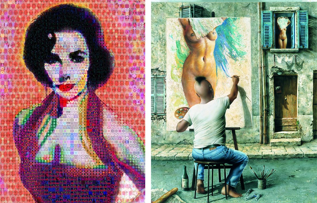Links das Collagen-Werk Collage-Liz von John Lijo (Format: 177 x 127 cm; Preis: 5.000 €), rechts das Werk Le Tableau von Mathias Vaske (Preis: 32.000 €). Man merkt: es geht preislich schon verdammt hoch zu teilweise. Das aktuell teuerste Werk liegt bei 38.000 €, die Suchmaske ist vorsichtshalber bis 50.000 € voreingestellt aber sicher noch erweiterbar. Ich persönlich bin kein Kunsthändler und Sammler, stelle es mir aber eher schwer vor, solche Summen „mal eben“ über das Web zu zahlen. Möchte man solche Werke nicht erst einmal aus der Nähe betrachten? Kennt man natürlich einen Künstler und ist Fan seiner Arbeiten, dürfte sich diese Frage wiederum erübrigen. Und keine Bange: Es gibt auch Werke unter 200 €.