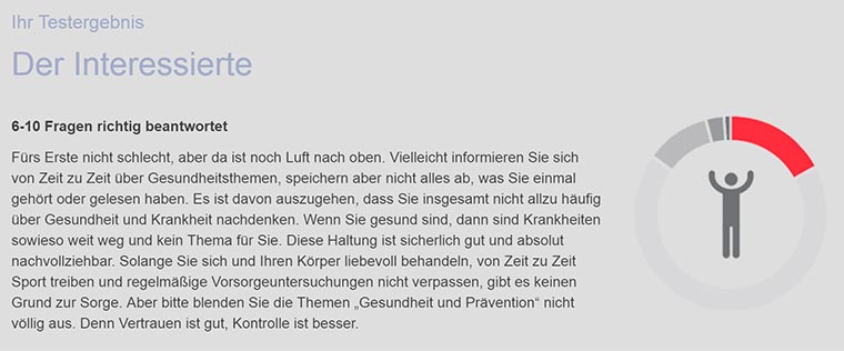 Das Gesundheits-Quiz solltet ihr am besten vor Anschauen der Report-Materialien machen, da dort viele Antworten gegeben werden. Ich habe so immerhin neun Richtige bekommen, was ich durchaus okay fand, auch wenn ich leider die nächste „Wissensstufe“ damit knapp verpasst habe. Und ihr so?