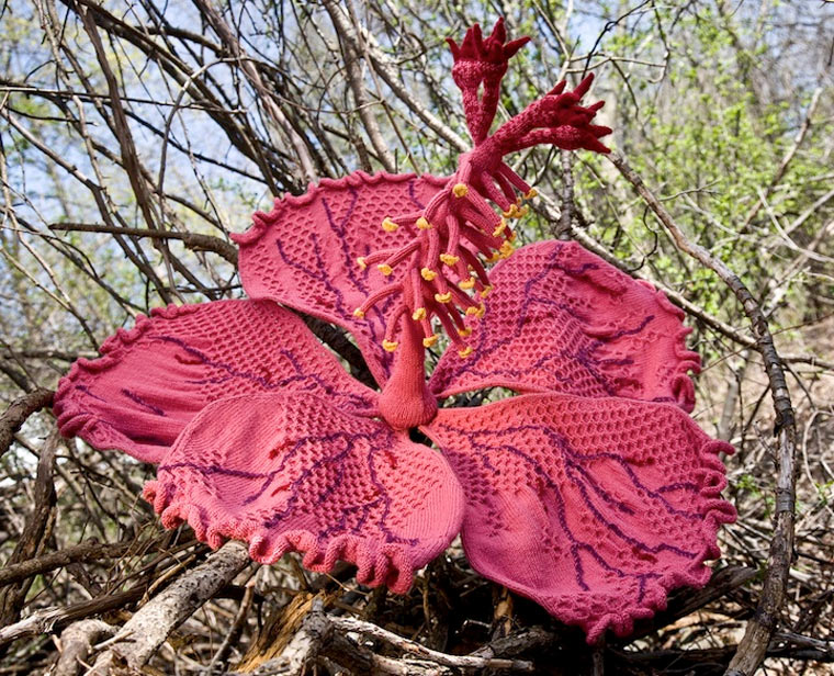Etwas stricken, das so aussieht wie eine Pflanze, kann vermutlich sogar ich. Okay, nicht wirklich, aber das dürfte tendenziell einfacher sein. Unter dem Motto Knit, Purl, Sow sind bis 22. Januar jedoch im Botanischen Garten Brooklyn einige Exemplare zu sehen, die wissenschaftlich korrekt aufgebaut sind. Also mit Adern, Blüten, Blättern und, und, und. Ihr wisst schon, korrekt eben.