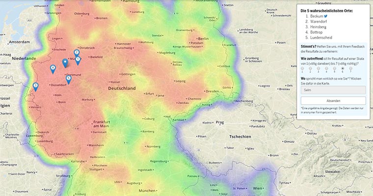 Die Daten stammen übrigens aus dem Atlas zur deutschen Alltagssprache (ADA), in dem 500 Orte statistik und wissenschaftlich hinterlegt sind. Okay, Fragen wie „Bezeichnung für eine Steinschleuder“ mit der Antwortmöglichkeit „Steinschleuder“ oder „Bezeichnungen für einen Sessel“ mit „Sessel“ sind eher weniger gelungen, insgesamt aber eine interessante Spielerei. Und bei mir gar nicht mal so verkehrt…