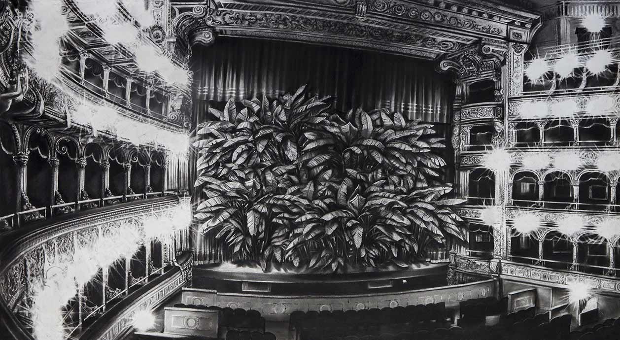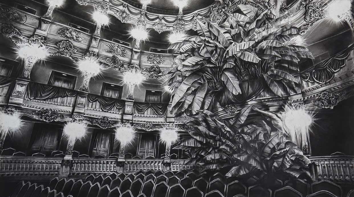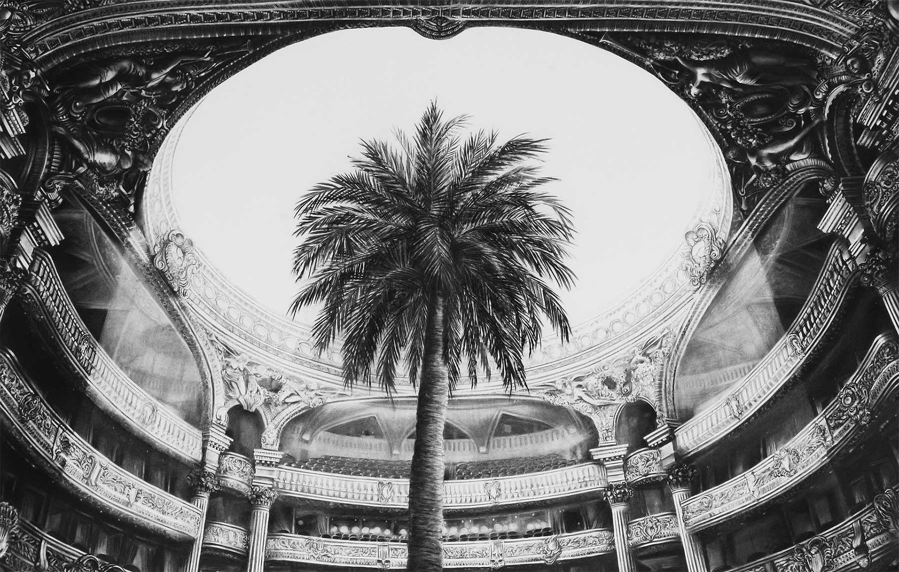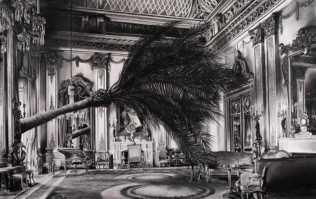 Auch wenn ich die Motive des kolumbianischen und mittlerweile in Miami lebenden Gonzalo Guenmayor jetzt nicht alle wirklich sinnig oder überzeugend finde, ist sein Zeichenstil schon durchaus als beachtlich zu bezeichnen. Vor allem in den kleinteiligen Innenraumszenerien, wie dem Bild mit der Palme, die ins Zimmer „hineinschaut“.