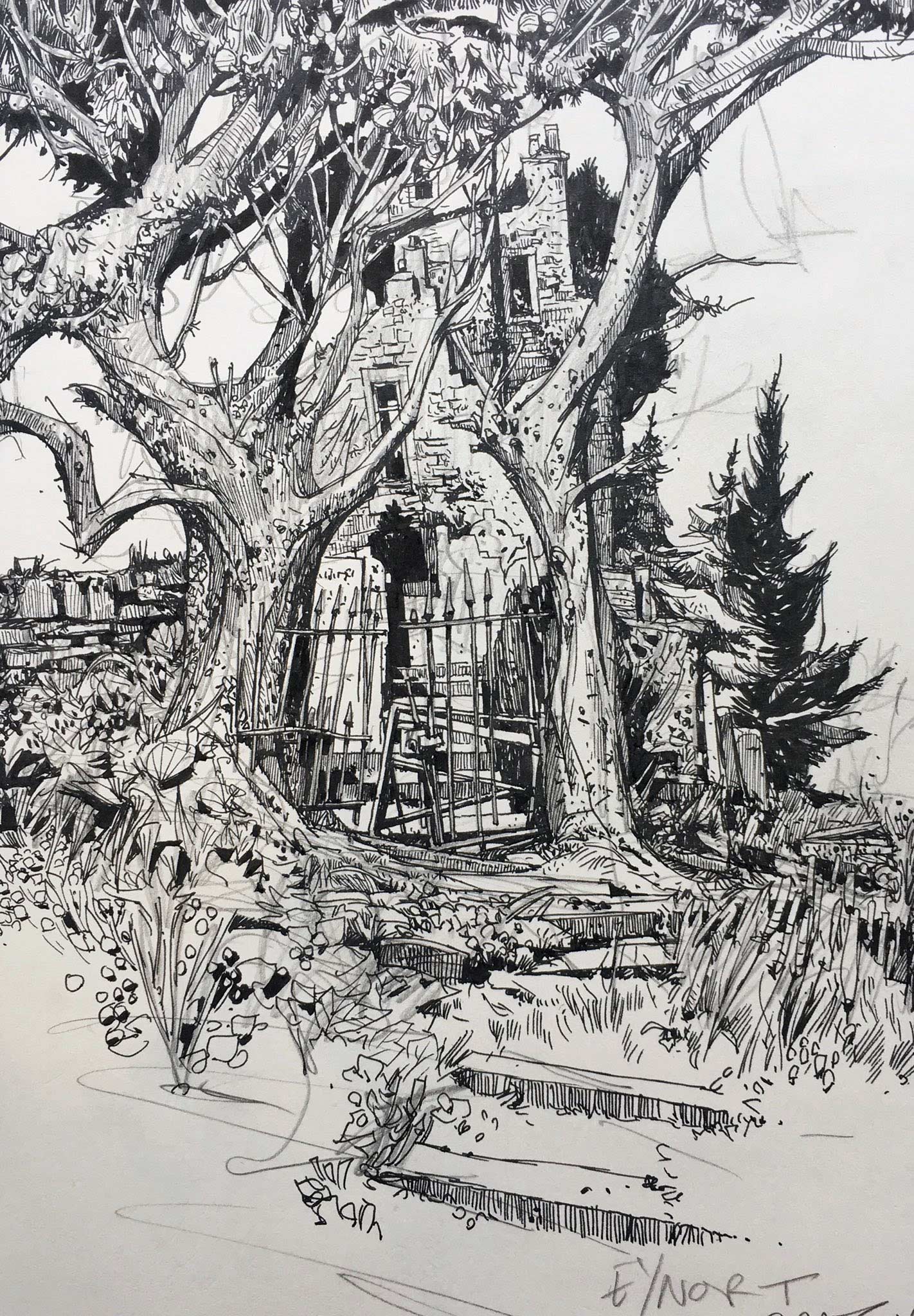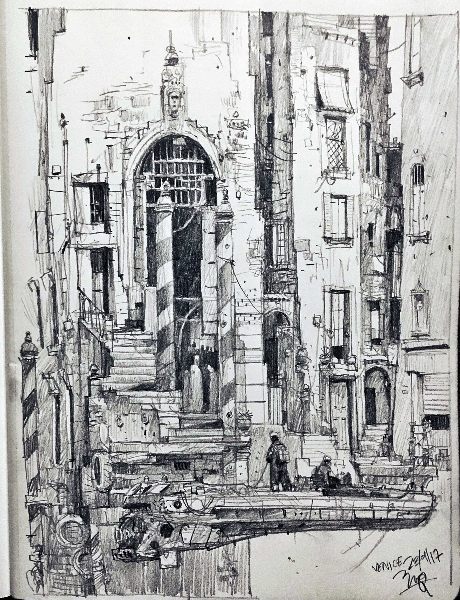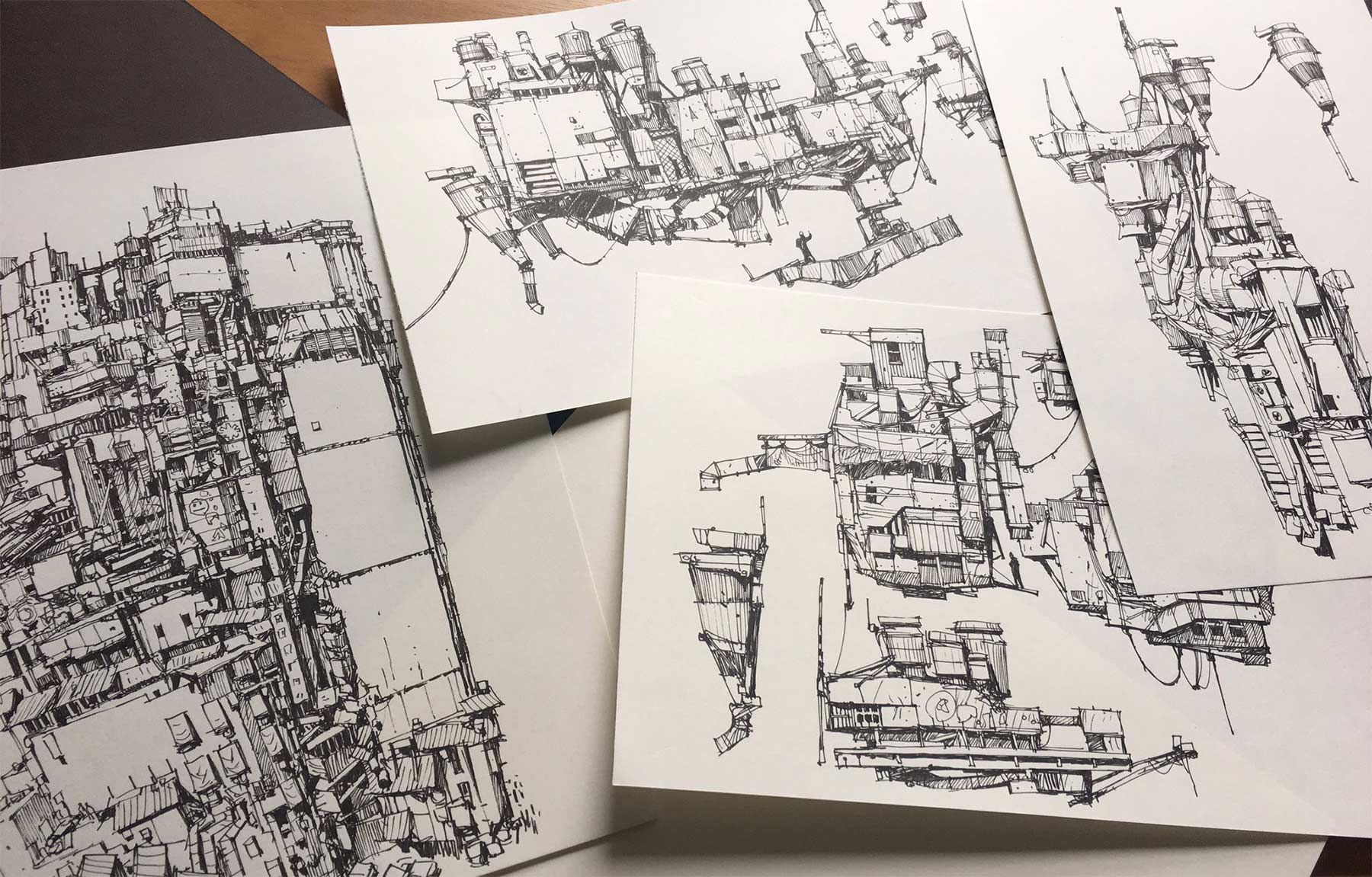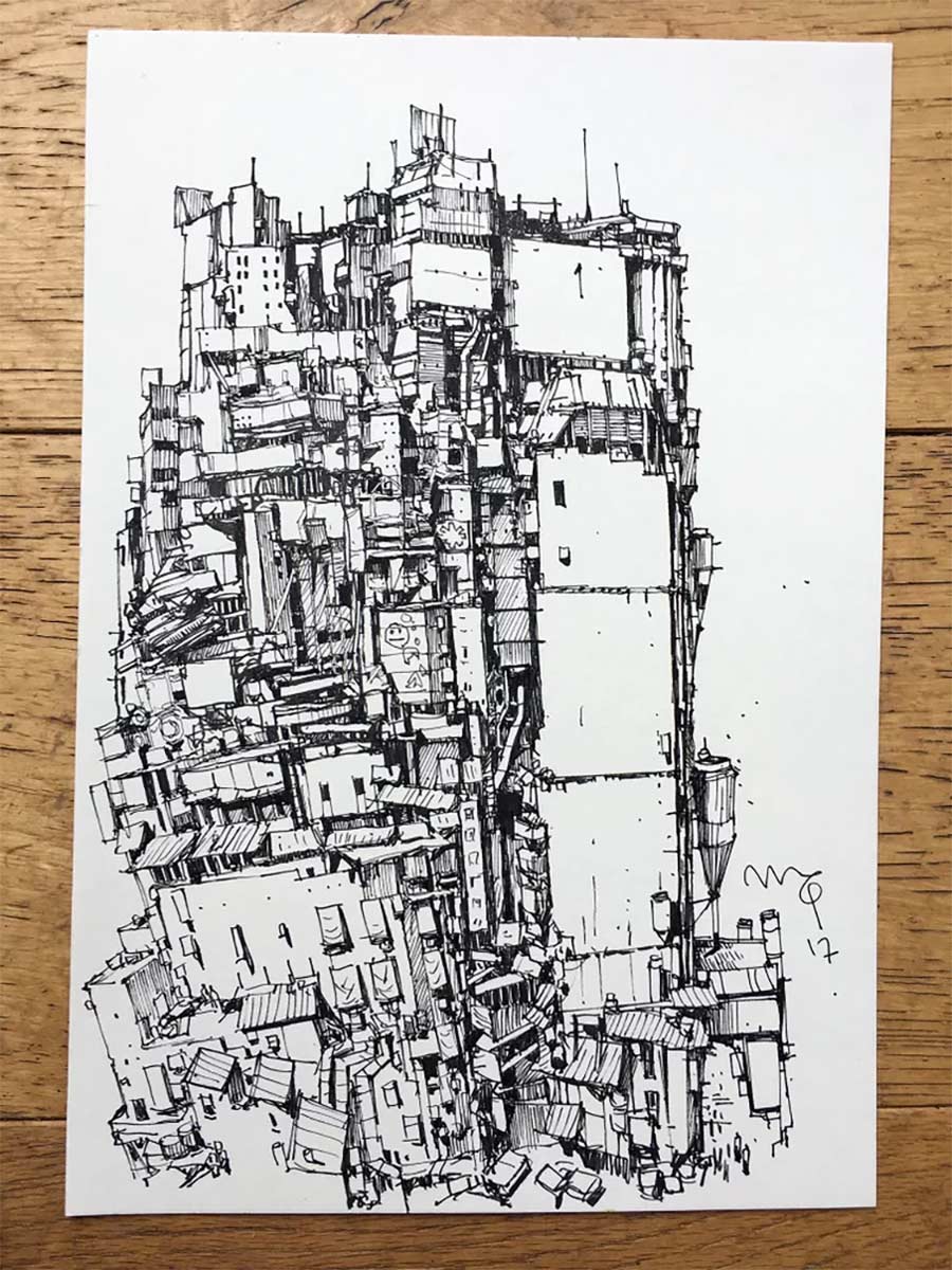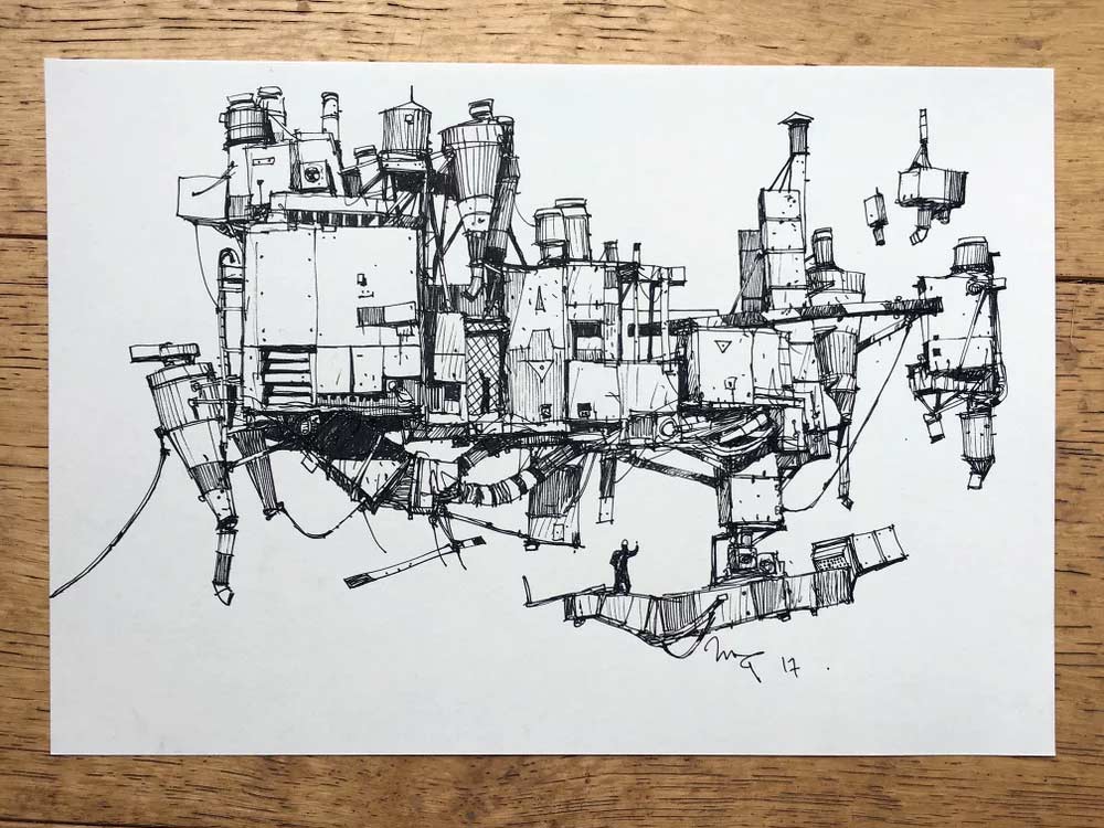 Ein Fineliner oder Bleistift und ein Blatt Papier oder Notizbuch – schon ist Ian McQue ready für ein neues kleines Meisterwerk. Und dann ist auch noch „Inktober“, wo er voraussichtlich täglich ein neues Architekturwerk in die Welt zeichnet. Der „Pro Doodler“ aus dem Norden erstellt sehr detaillierte und fantasievolle Gebäude- und Raumschiffkonstruktionen, aber auch gelungene Portraits und mehr.