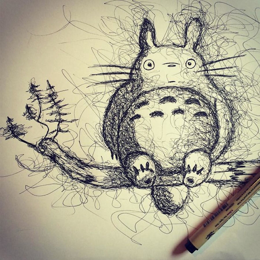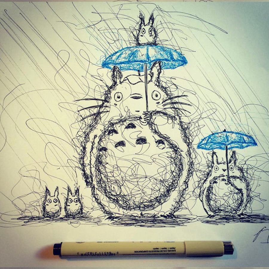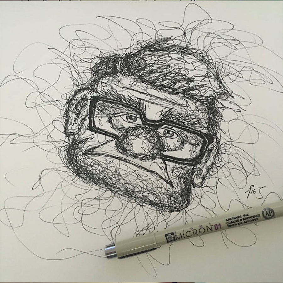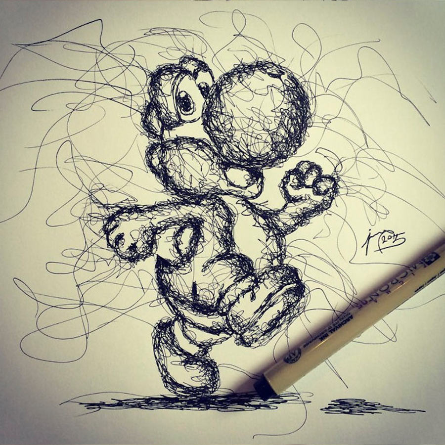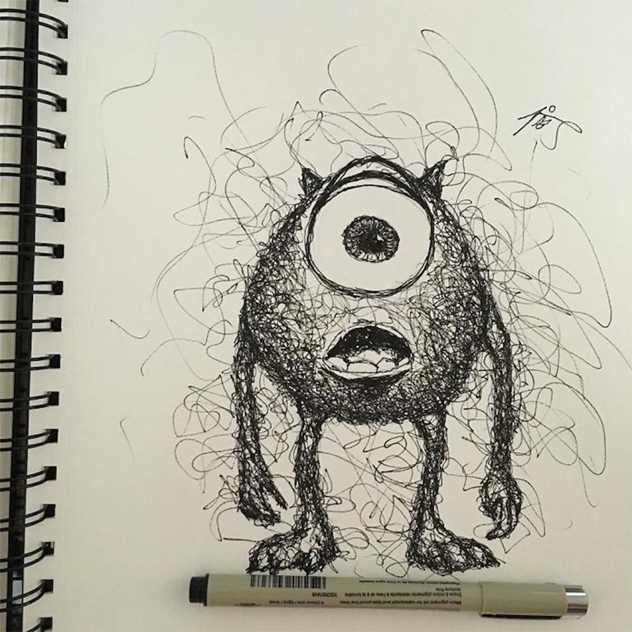 „I started to sketch with this black liner pen (Micron 01), but one day I made a mistake when I was sketching. It was like I lost focus but I thought this mistake looked pretty good. So I made this mistake out of nowhere and then I began my new journey on this new style. I started this shaky hands drawing that some of my friends call it. But now I know it’s called scribble.“
