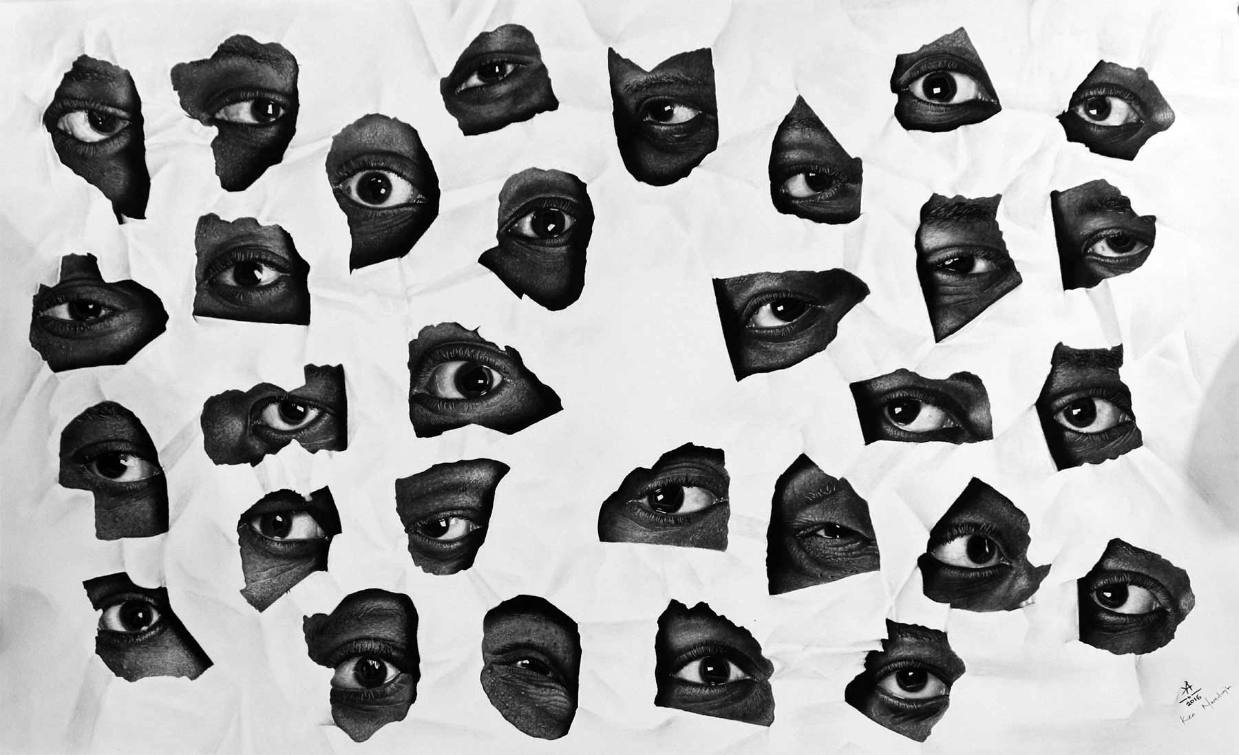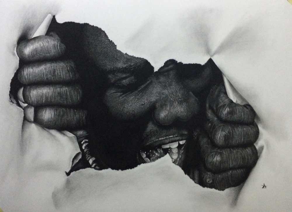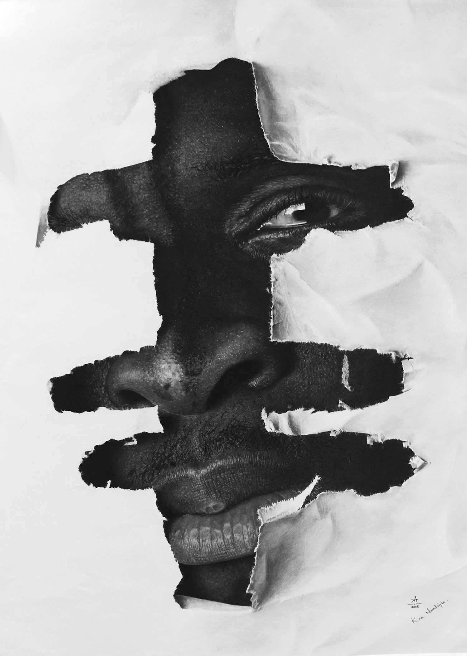 Wow. Würde Ken Nwadiogbu nicht noch diese Papierriss-Illusionen in seine Werke einbauen, könnte man direkt denken, es handele sich um Schwarz-Weiß-Fotografien. Der 23-jährige Künstler aus Nigeria erschafft hyperrealistische Portraits mit dem Bleistift, die so großartigt sind, wie sie groß ausfallen. Die Bilder des Autodidakts überragen nicht selten seine eigene Körpergröße – und das, obwohl sie oftmals lediglich Köpfe darstellen.