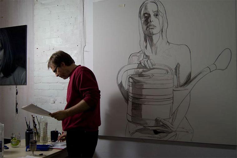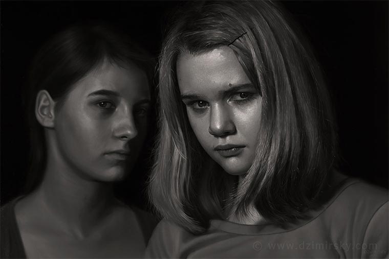 „Dirk Dzimirsky’s ideas are often captured as sketches, to become aware of the composition and accentuation of light and shadow, before the photos are taken. Afterwards, appropriate photos are taken with suitable models, either in the studio or at a selected location. A selection of photos is being edited on the computer to be used as a guideline for the actual drawing / painting.“