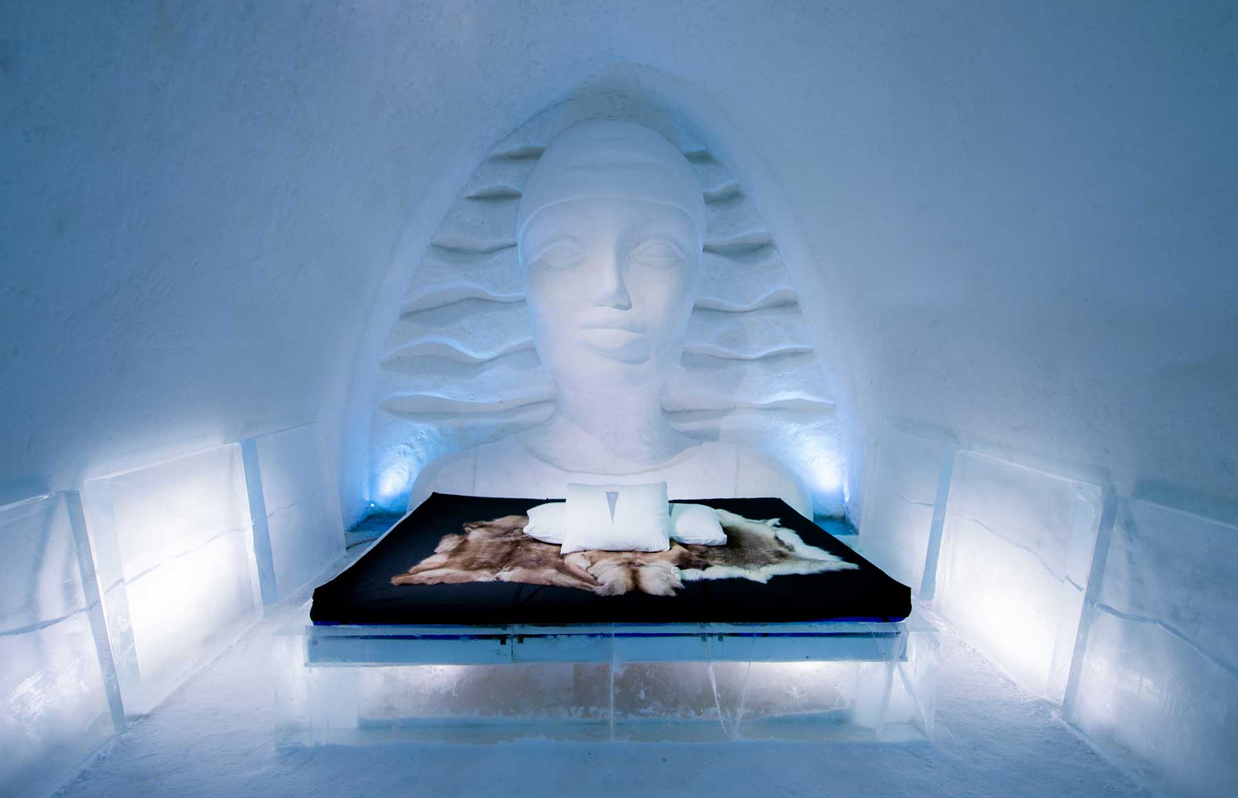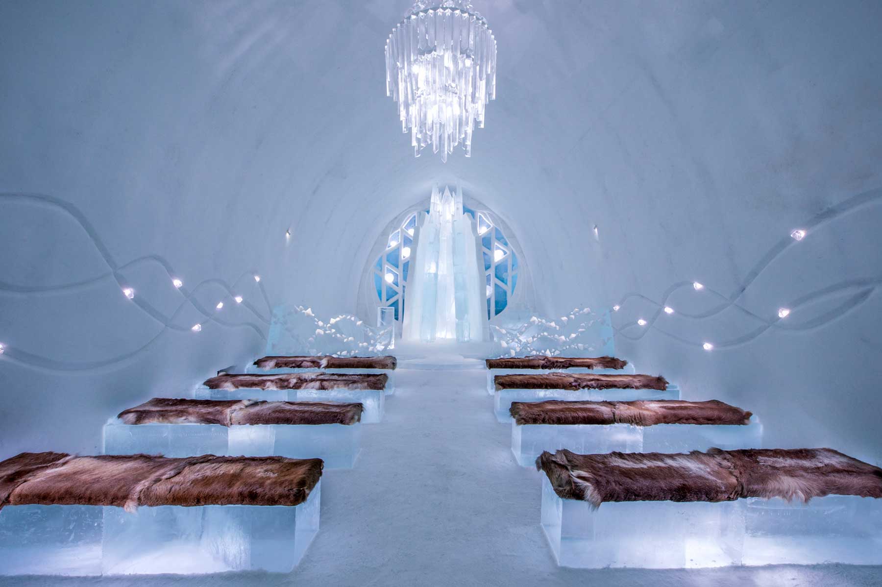 „A hotel and art exhibition made of ice from the river Torne, each year reincarnated in a brand new design. A place to discover silence, northern lights, glistening snow clad forests, reindeer, cloudberries, kettle coffee and much more.“